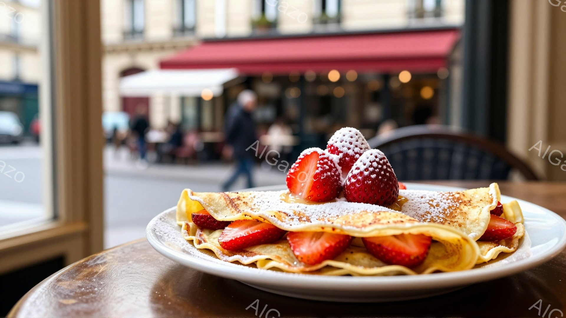 白い皿に、粉砂糖とイチゴをトッピングしたクレープが置かれています。クレープからは赤いジャムが流れ出し、美味しそうな光景です。背景には、カフェの窓から見える賑やかな通りと建物が見え、春の明るい日差しが差し込んでいます。