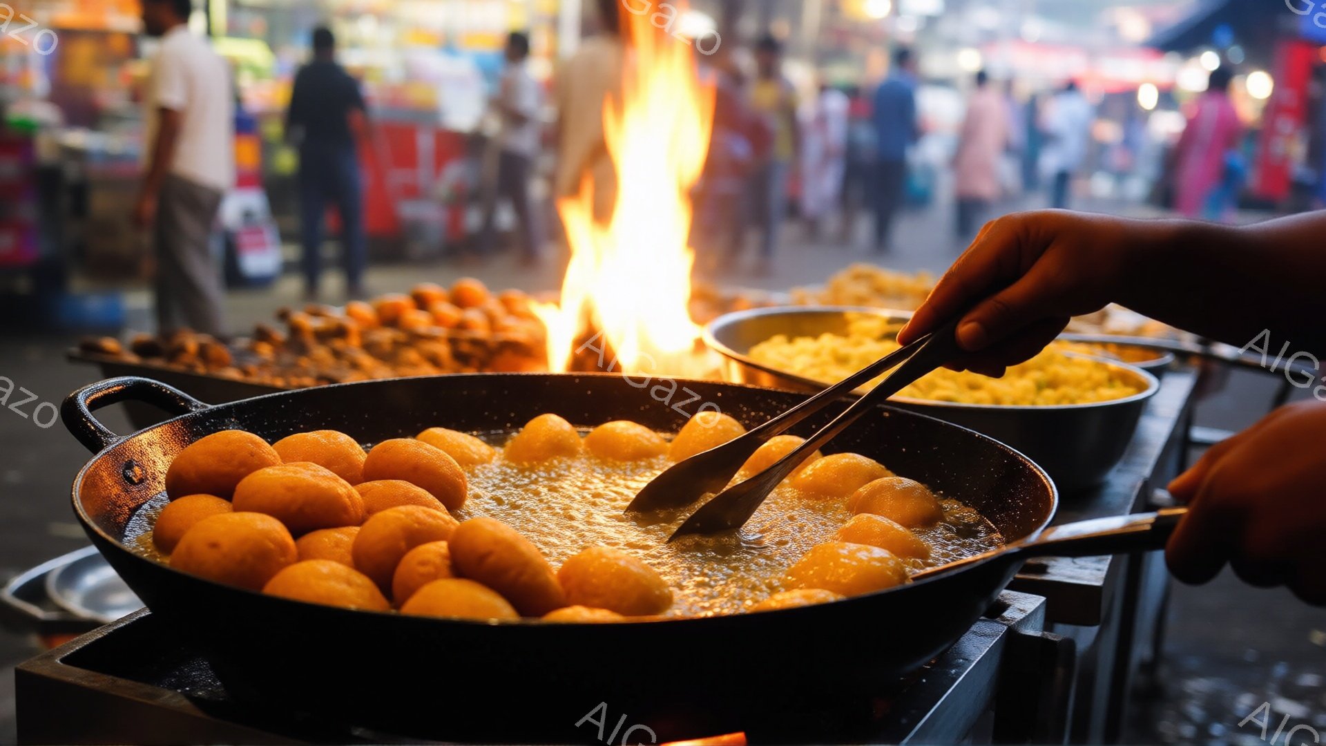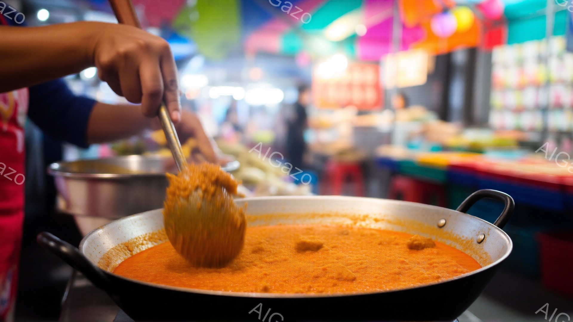 大きな鍋の中に赤いスープが煮込まれており、手でヘラを使ってスープを混ぜている様子が写っている。背景には、様々な食材を並べた屋台や赤い椅子がぼやけて写っており、活気のある市場の雰囲気が伝わってくる。全体的に暖色系の色調で、食欲をそそるような、賑やかな屋台の光景が印象的だ。