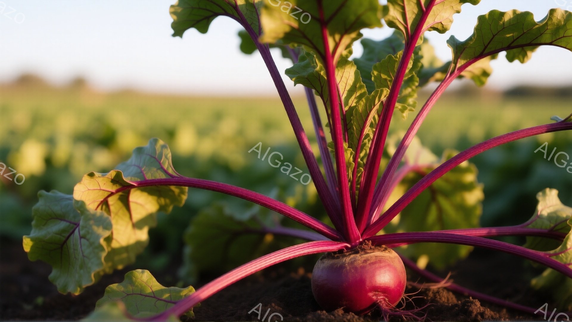 赤く丸い大根が土の中から顔を出しているクローズアップ写真です。緑の葉が生き生きと茂り、背景には畝が連なる畑が広がっています。全体的に暖かく、新鮮な収穫を予感させる雰囲気です。