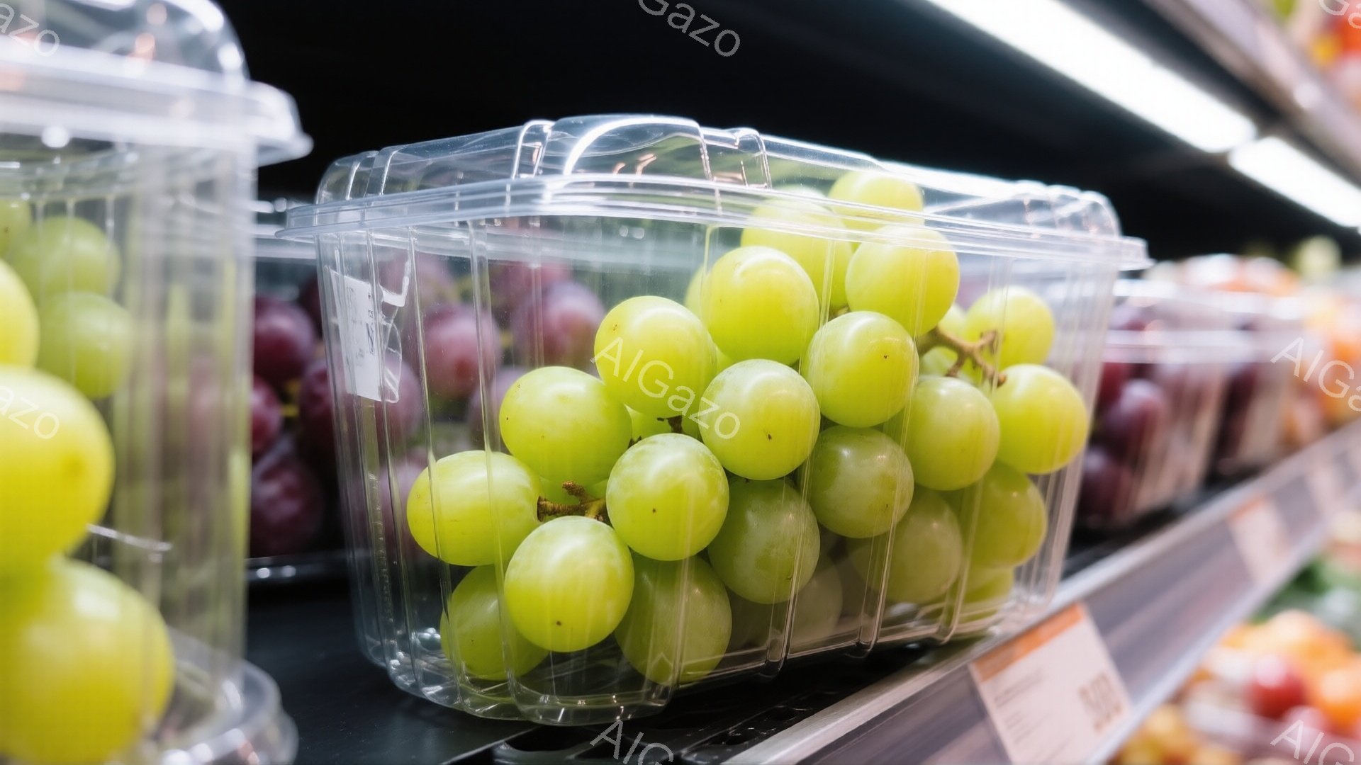 画像には、スーパーマーケットの棚に並べられた、透明なプラスチックケースに入った緑色のぶどうが写っています。隣には紫色のぶどうが並び、価格表示タグが各ケースに付いています。全体的に明るく清潔な印象で、食料品の販売スペースであることがわかります。