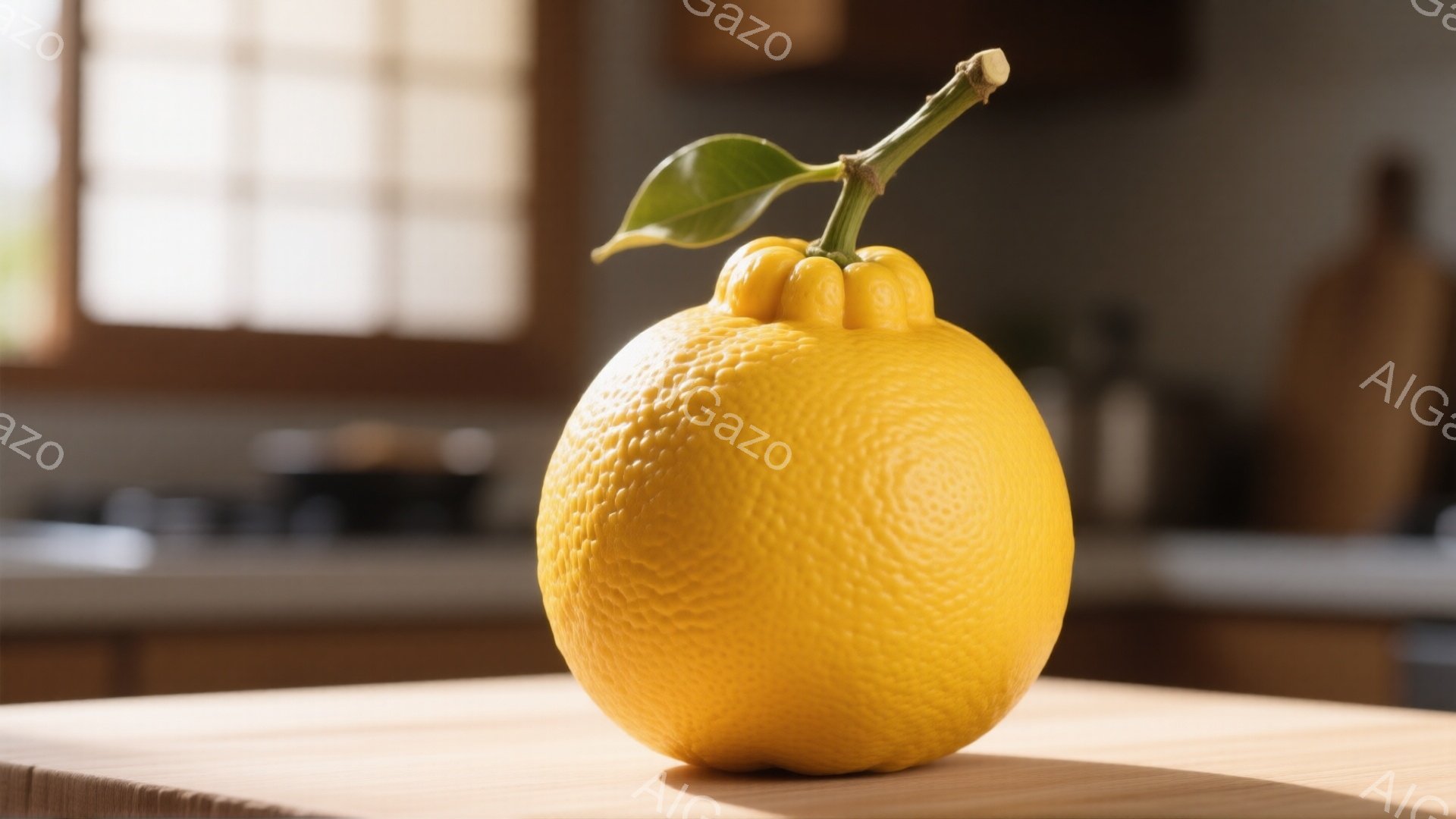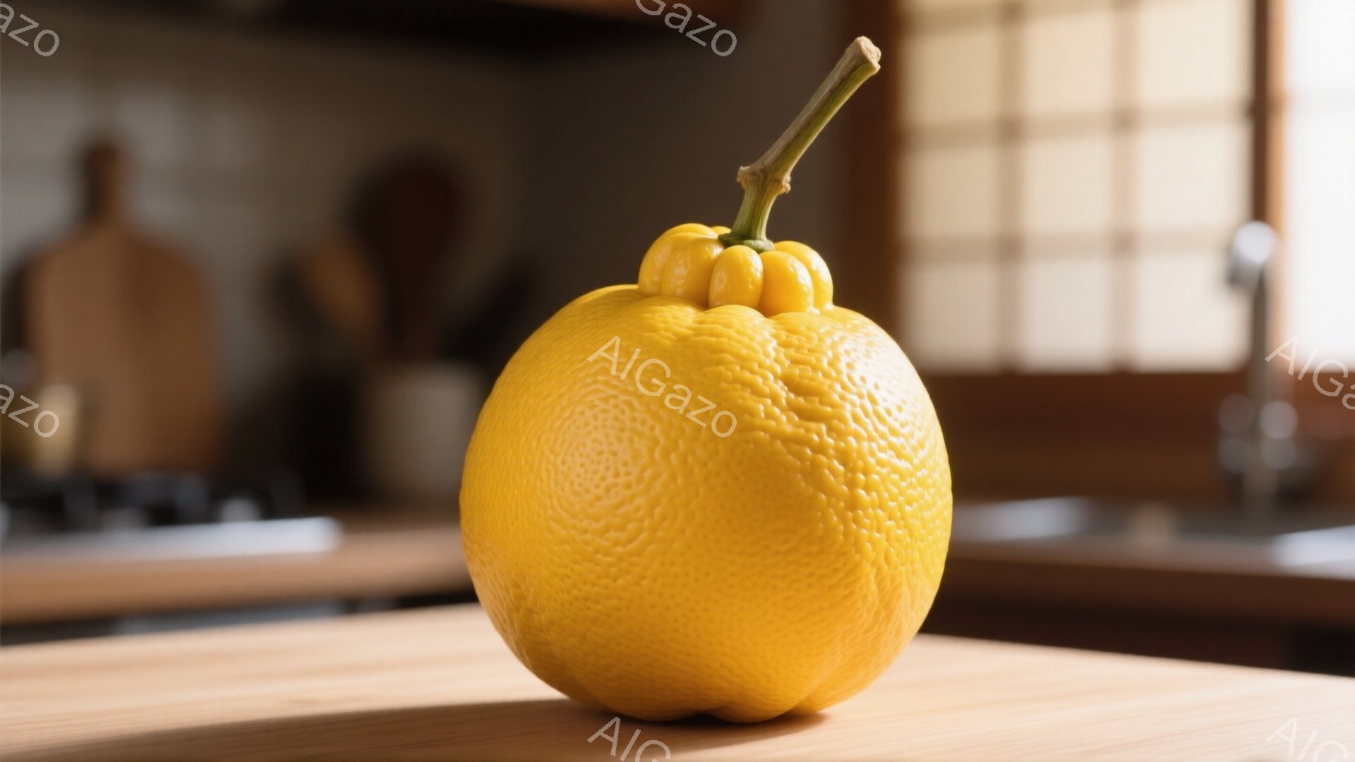 鮮やかな黄色の大きな仏手柑が木製の板の上に置かれています。背景にはぼやけたキッチンの一部が見え、窓からは柔らかい光が差し込んでいます。全体的に暖かく、静謐な雰囲気が漂っています。