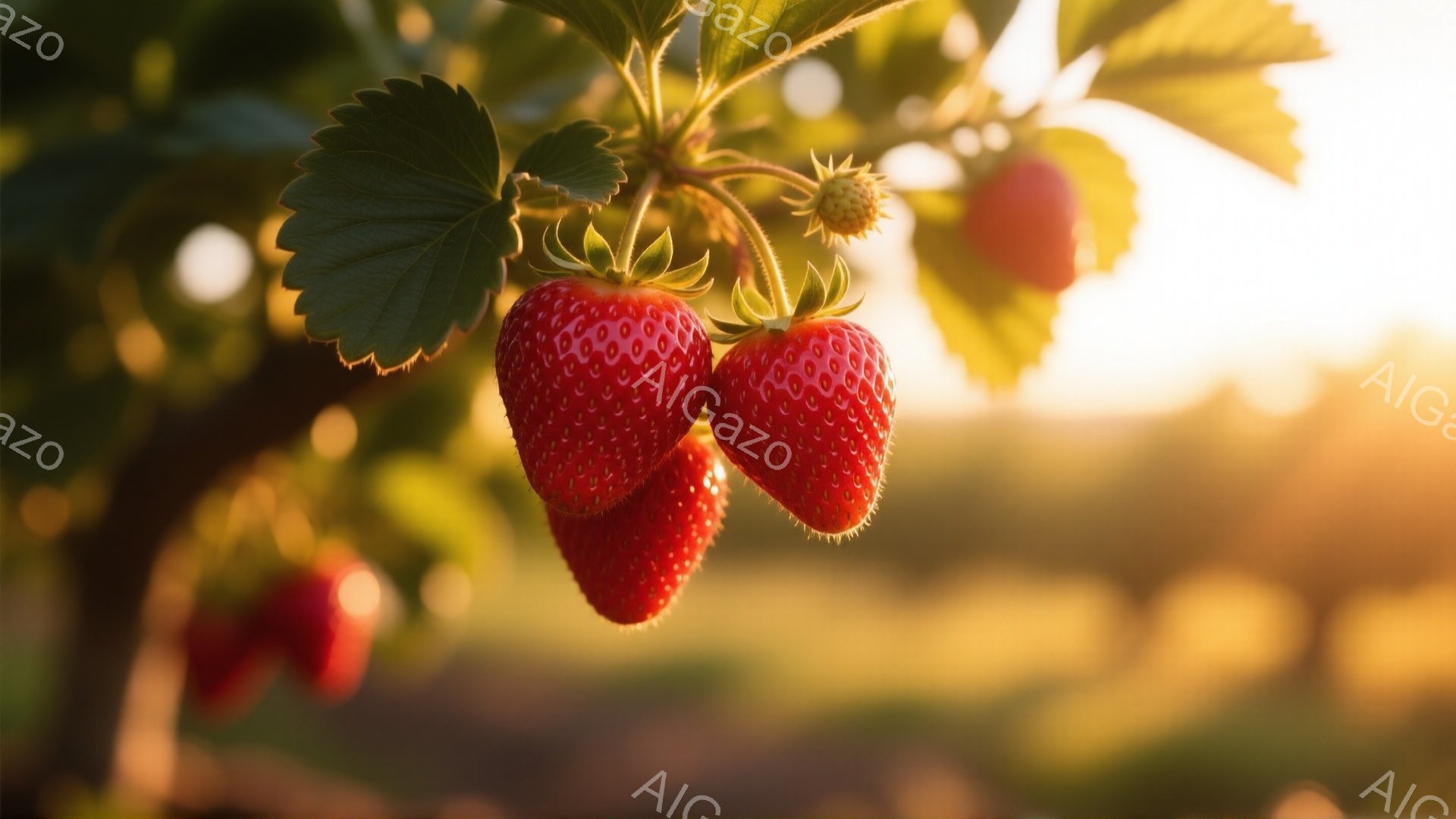 鮮やかな赤色のいちごが、緑の葉に囲まれて枝にぶら下がっている。背景は柔らかい光に包まれた緑豊かな庭園で、夕日または朝日が差し込み、暖かく穏やかな雰囲気を醸し出している。いちごの表面の細かい粒や葉の緑、そして背景のぼかしが、自然の美しさを際立たせている。