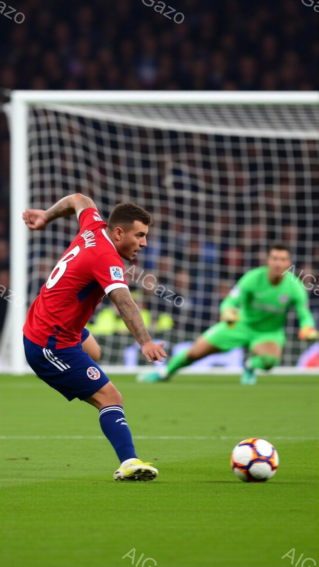 「サッカーの試合が行われている様子で、一人の選手がボールを蹴り出そうとしています。青いユニフォームの選手(背番号17)はボールを見つめ、白いユニフォームの選手(背」は、2025年12月13日に作成されたAI生成画像です。 キックをテーマとした高品質なビジュアル素材で、 1080×1920px の解像度で提供しています。 個人利用・商用利用ともに無料でダウンロード可能で、クレジット表記も不要です。