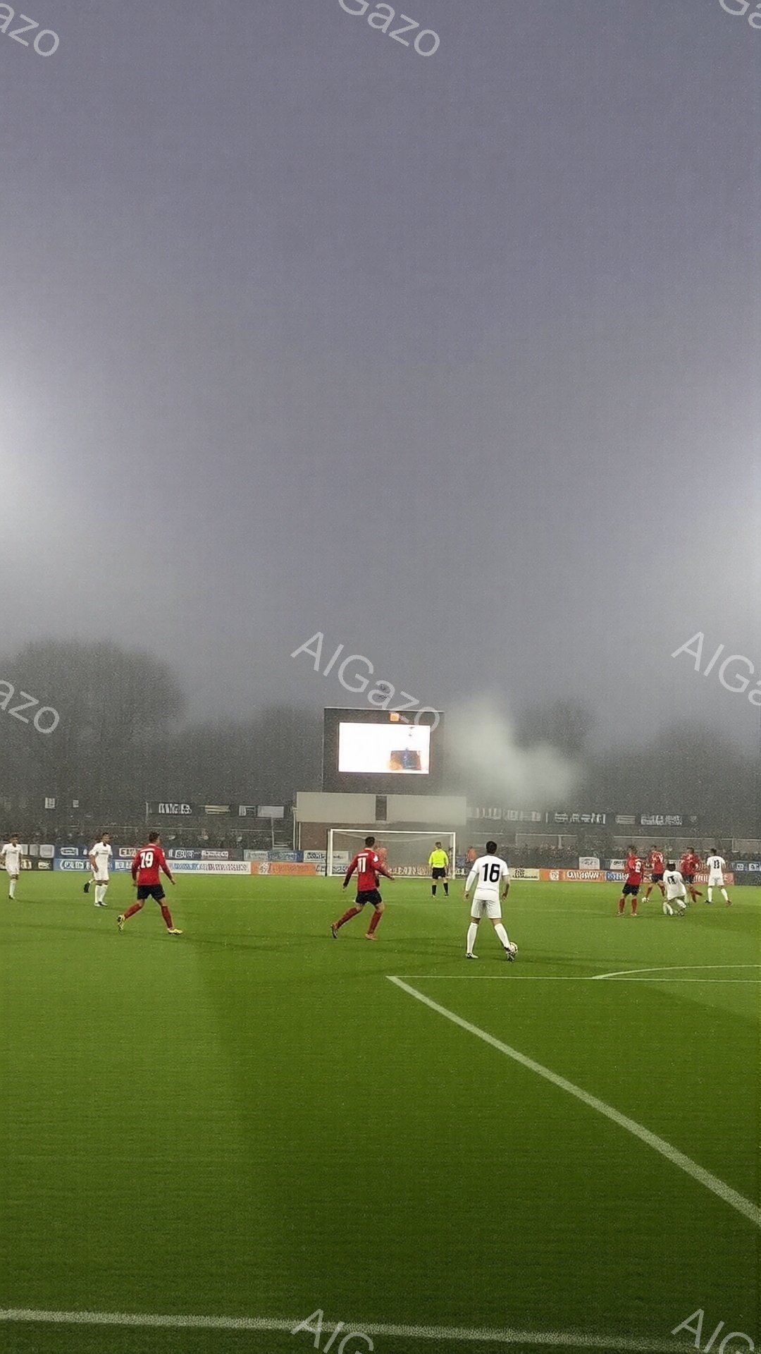 鮮やかな緑色の人工芝のサッカー場に、オレンジ色のコーンと青いリングが並べられたドリブル練習のコースが写っている。数人のサッカー選手が練習に参加しており、一人は赤いシャツと黒いショーツ姿で、後ろを向いて何かを話しているようだ。背景には青い座席の観客席が見え、屋内のスタジアムで天候の影響を受けずに練習できる様子がうかがえる。