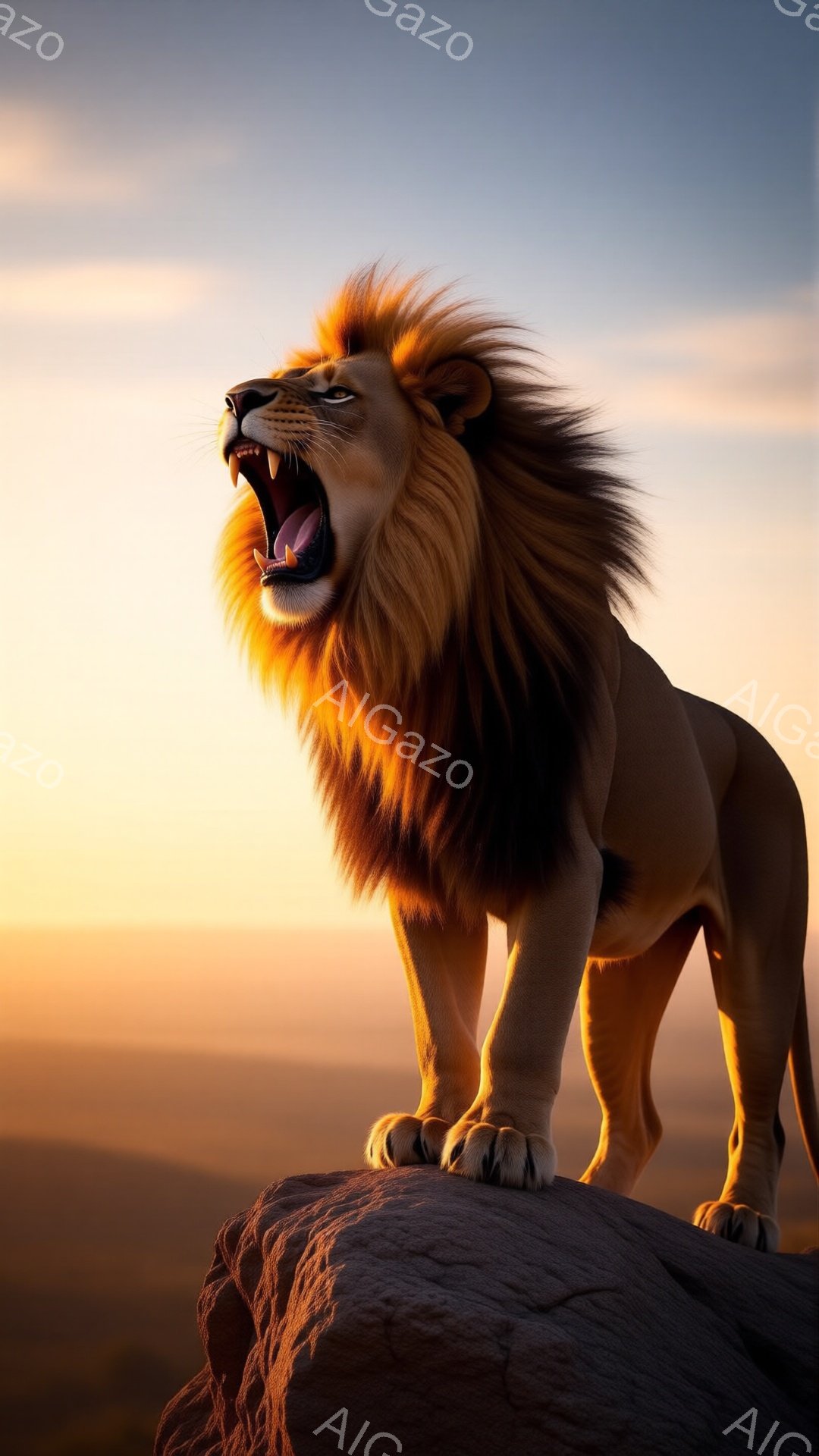 広大なサバンナの丘の上に、堂々とした雄ライオンが立っている。その顔つきは威厳に満ちており、遠くを見つめる姿は力強さを感じさせる。背景には黄金色の草原が広がり、薄い雲が広がる空が、雄ライオンの存在感を際立たせている。
