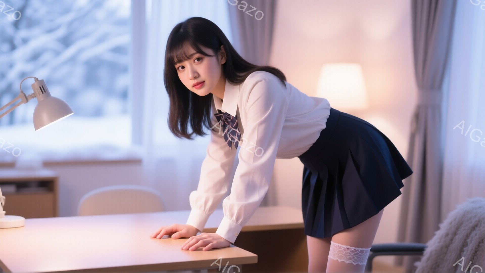 長い黒髪の女性が、白いブラウスとプリーツスカートの制服を着て、わずかに前かがみの姿勢で机にもたれかかっています。彼女は微笑んでいて、表情は魅力的です。背景には窓から見える雪景色と、ソファが見え、室内の温かく穏やかな雰囲気が漂っています。