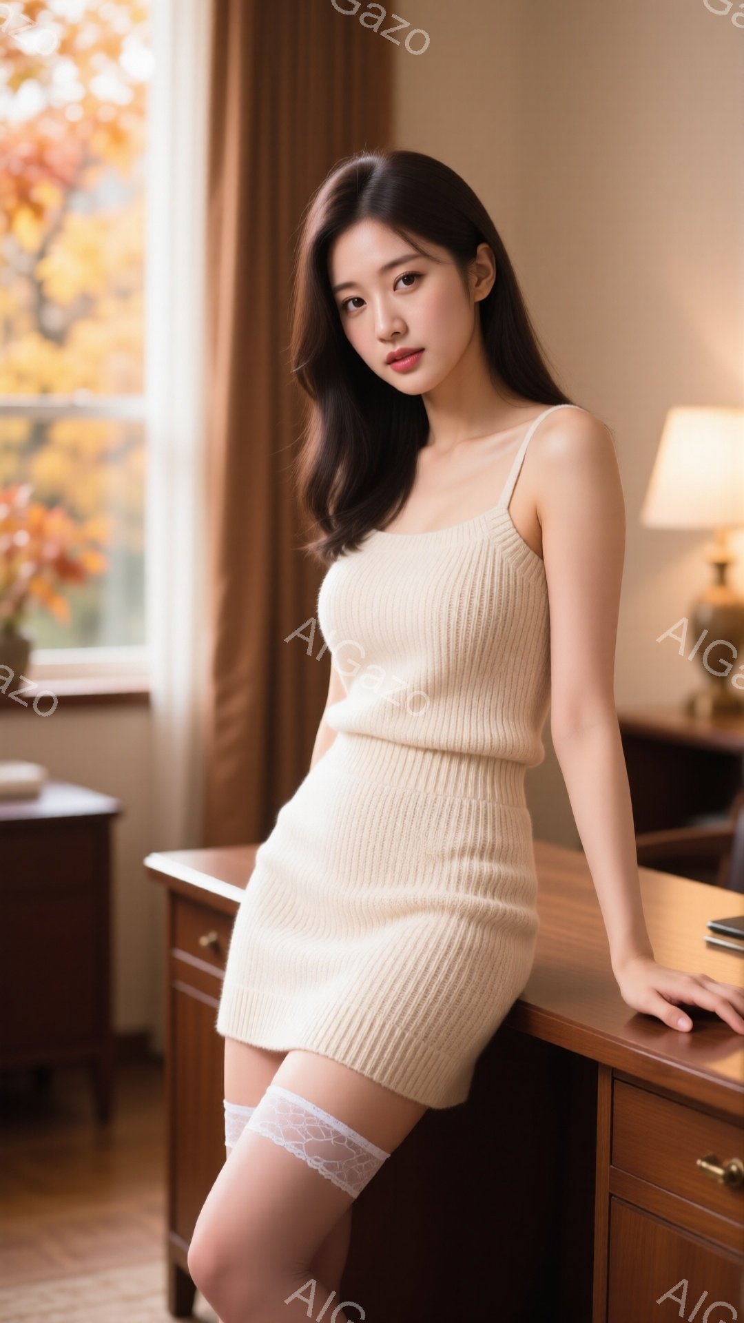 明るい茶色のニットのミニドレスを着た若い女性が、木製のデスクに寄りかかっている。彼女は長い茶色の髪を背中に垂らし、控えめな微笑みを浮かべている。背景には、暖色系の植物が飾られたキャビネットと、窓の外の自然が見える、居心地の良い内装の部屋が広がっている。