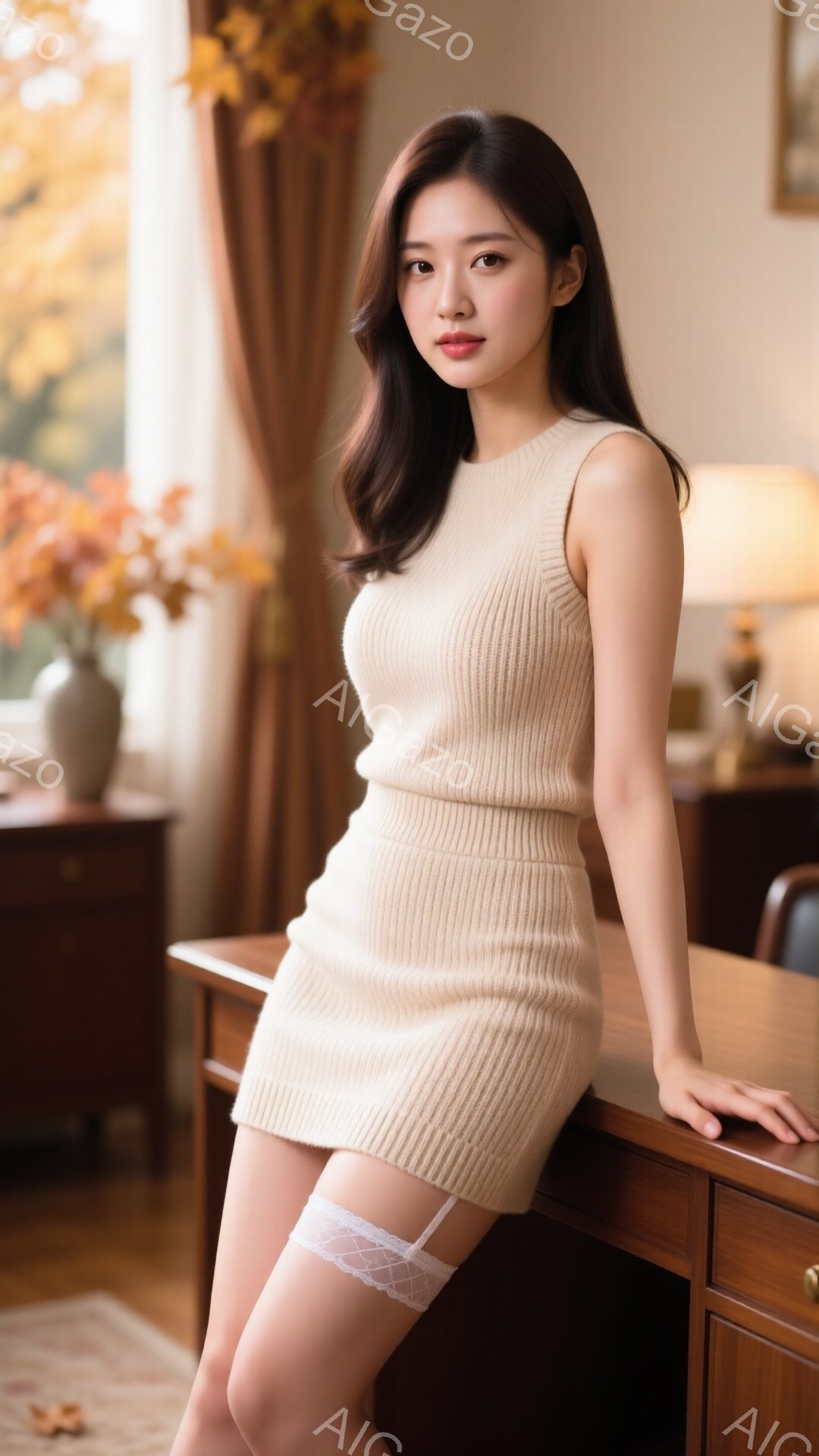 「長い黒髪で、前髪は眉毛にかかるように整えられています。ベージュ色のタートルネックセーターと、茶色のプリーツスカートを着用し、白いレースのガーターベルトを覗かせて」は、2025年12月22日に作成されたAI生成画像です。 ガーターベルトをテーマとした高品質なビジュアル素材で、 1080×1920px の解像度で提供しています。 個人利用・商用利用ともに無料でダウンロード可能で、クレジット表記も不要です。