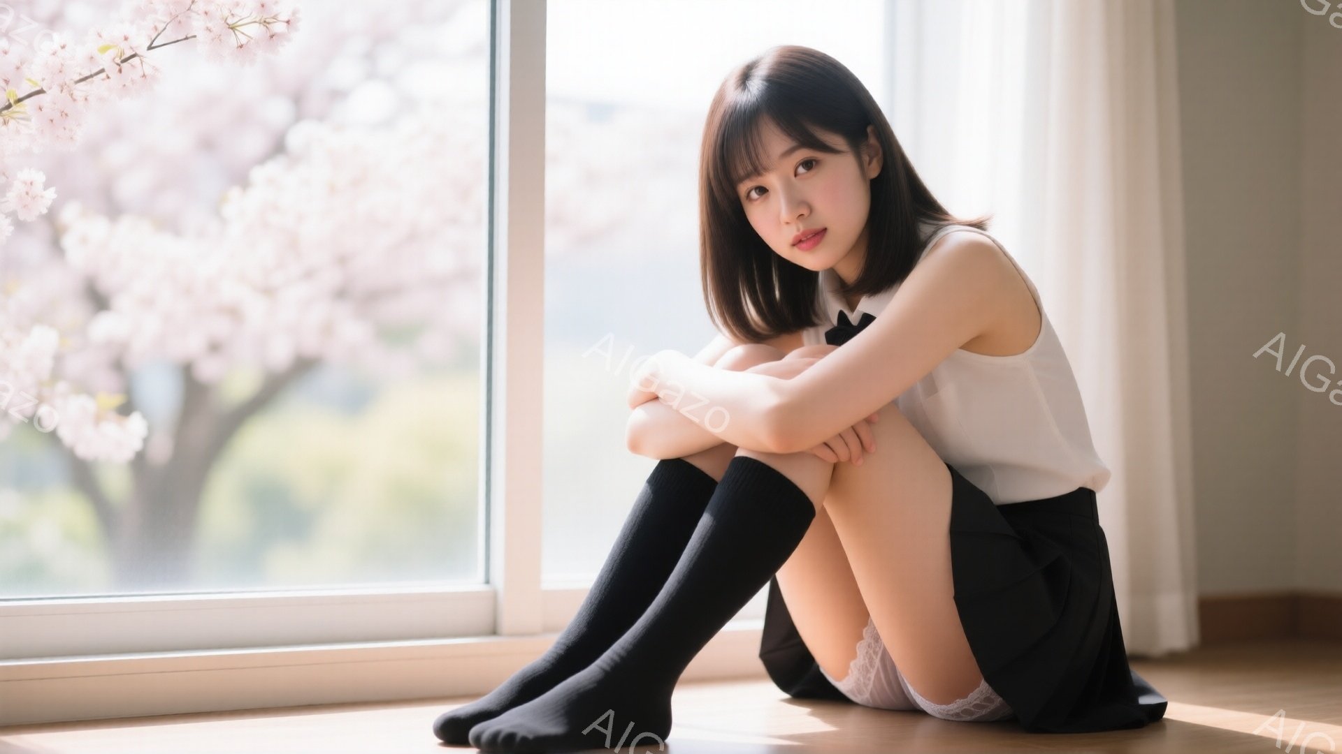 若い女性が窓際に座り、膝を抱えています。白いタンクトップと黒いスカート、膝丈の黒いソックスを履いています。窓の外には桜の木が見え、春らしい穏やかな雰囲気が漂っています。