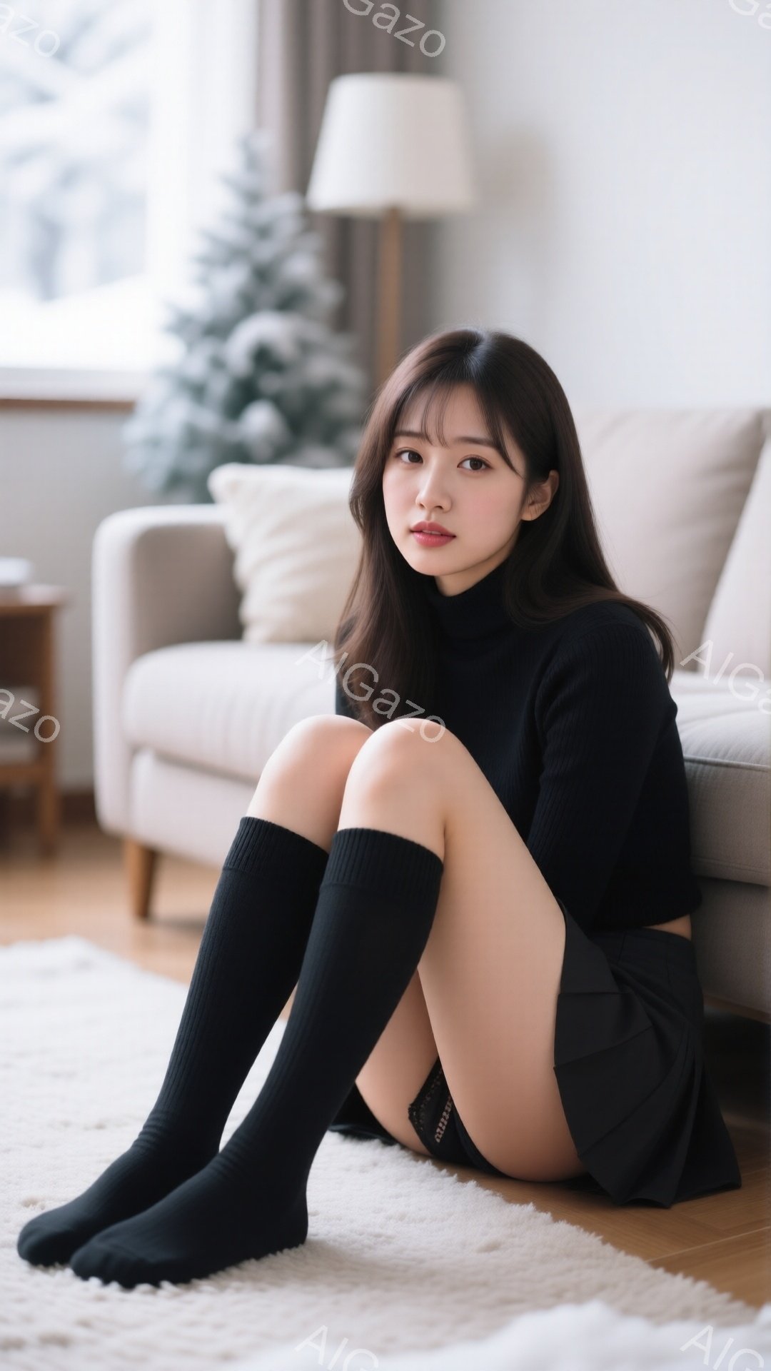 彼女はベージュ色のニットセーターと黒いニーハイソックスを着用し、灰色のソファに座って膝を抱えています。少し憂いを帯びた表情でカメラを見つめ、後ろには暖色系の照明と秋らしい背景の風景がぼやけています。室内は居心地が良く、秋の暖かさを感じさせる雰囲気です。
