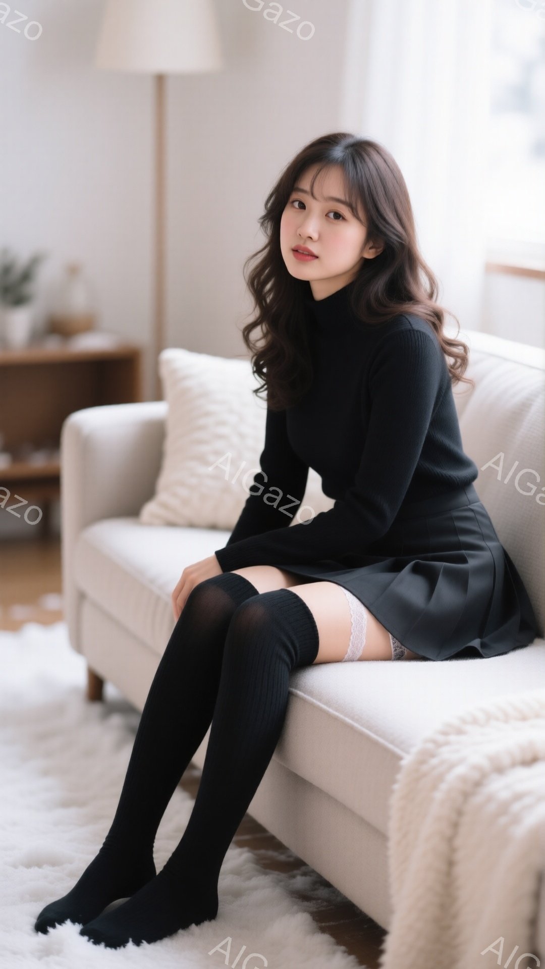 「黒髪のボブヘアの女性が、白いシャツに黒いカーディガン、黒い膝丈スカートと黒いニーハイソックスを着用して椅子に座っています。彼女はわずかに微笑んでいて、リラックス」は、2025年12月22日に作成されたAI生成画像です。 カーディガンをテーマとした高品質なビジュアル素材で、 1080×1920px の解像度で提供しています。 個人利用・商用利用ともに無料でダウンロード可能で、クレジット表記も不要です。