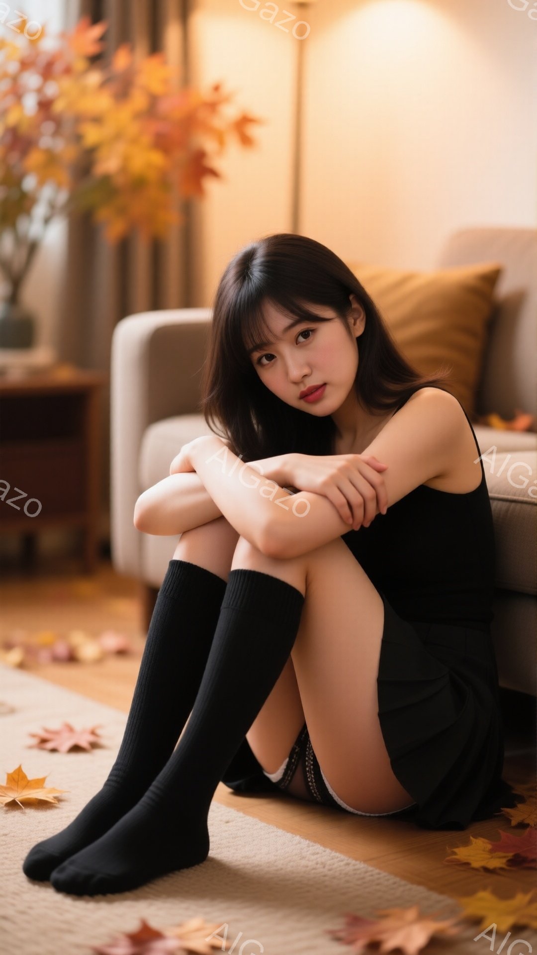 黒いセーターとミニスカート、そして黒いニーハイソックスを身につけた女性が、クリーム色のソファに横たわっています。彼女は片手を頭の下に置き、リラックスした表情でカメラを見つめており、落ち着いた雰囲気が漂っています。背景には明るい窓と、ぼんやりと見える家具があり、部屋全体が暖かく穏やかな光に包まれています。
