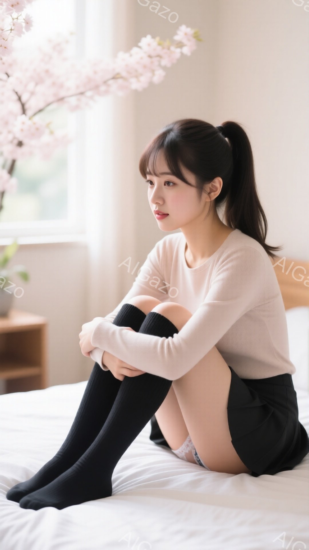 長い黒髪をポニーテールにし、前髪は眉毛にかかるようにカットされた女性が描かれています。ベージュの長袖トップスに黒いニーハイソックスを履き、膝を抱えて白いベッドに座っています。背景にはピンク色の花が咲き誇る桜の木が見え、柔らかく優しい雰囲気を醸し出しています。