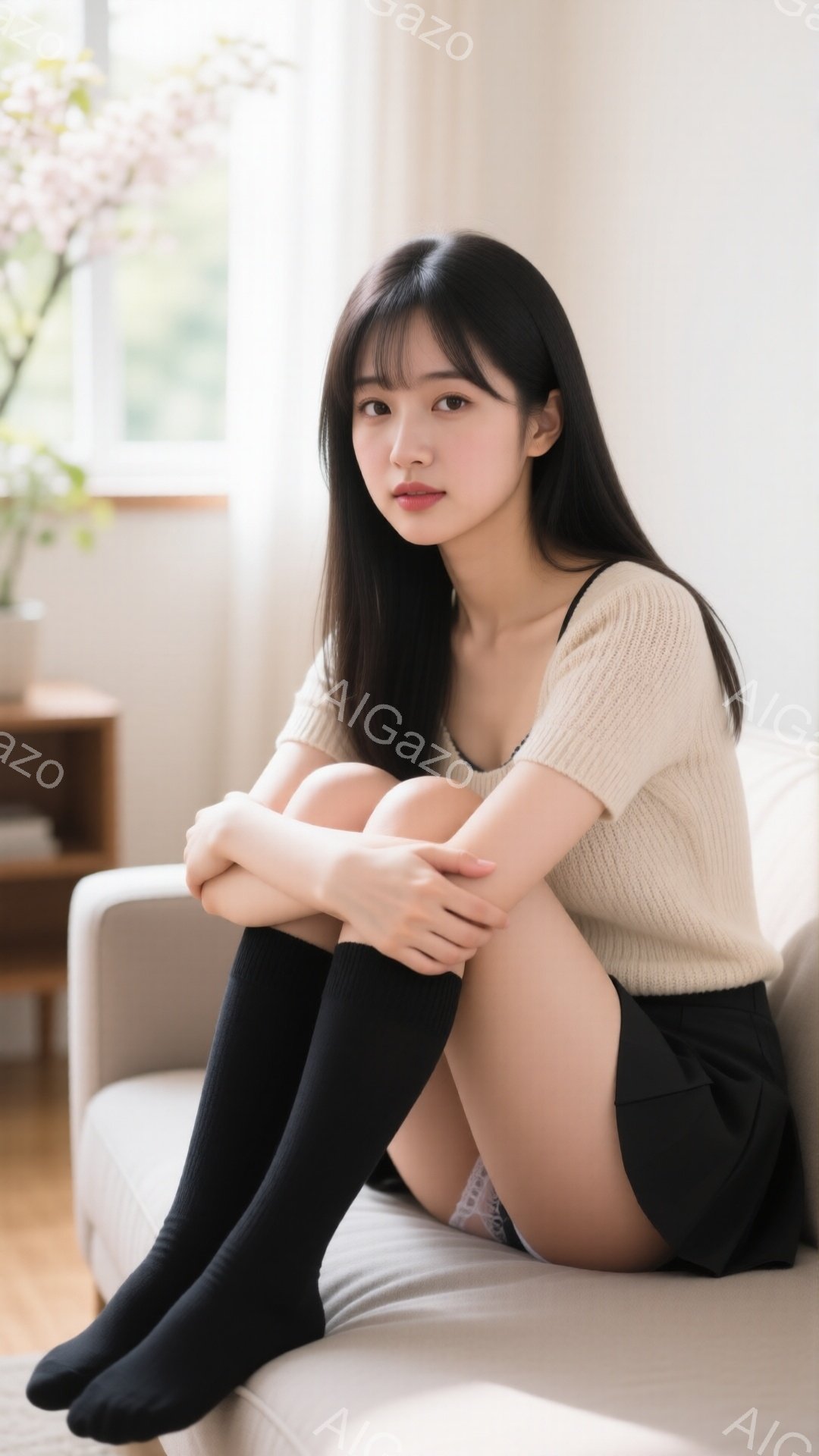 長い黒髪の女性が、ベージュのセーターと黒のニーハイソックスを履いて、灰色のソファに膝を抱えて座っています。彼女は控えめでわずかに微笑んだ表情をしており、背景には窓から差し込む光と、小さなテーブルに飾られた花が見えます。全体的に、暖かく穏やかな雰囲気の室内ショットです。