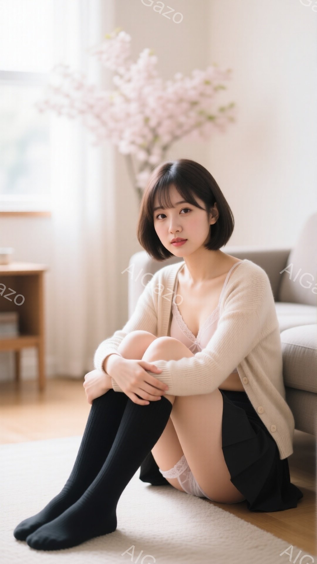 長い黒い靴下と黒いミニスカートを履いた女性が、ベージュ色のブラレットを着てソファに座っています。彼女は右を向き、微笑んでおり、髪は後ろでポニーテールに結ばれています。窓から差し込む光が部屋を明るく照らし、背景には家具が見え、全体的に穏やかでリラックスした雰囲気です。