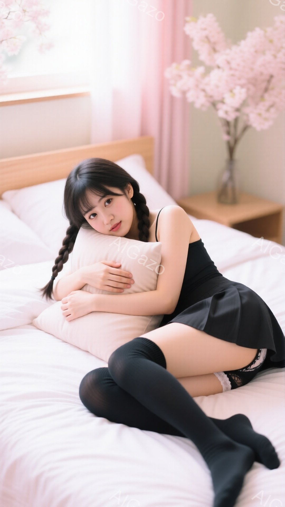 黒髪を三つ編みにした女性が、白いベッドの上で膝を抱えて座っています。黒いトップスとミニスカート、そして膝丈の黒いソックスを身に着けており、表情は少し微笑んでいるように見えます。背景には窓とピンク色の花が映り、全体的に柔らかく、優しい雰囲気です。