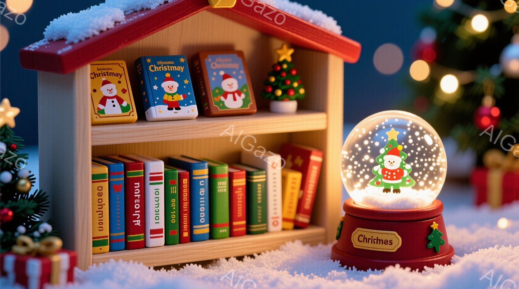 暖炉のような赤い屋根のミニチュアの本棚が映っており、クリスマスをテーマにした様々な本が並んでいます。雪が降る背景には、キラキラと光るクリスマスツリーがあり、雪の積もった地面には、中にクリスマスツリーが入った雪の玉が置かれています。全体的に暖かく、クリスマスの季節の心地よさと喜びを感じさせる雰囲気です。