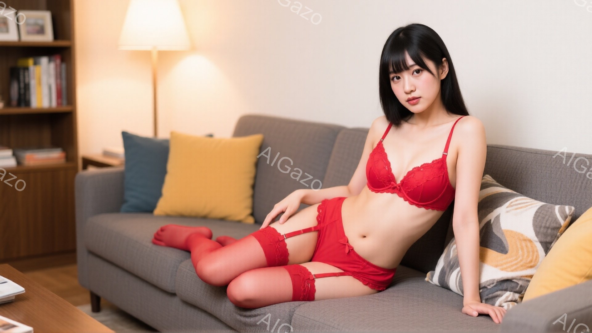 長い黒髪に前髪ぱっつんの女性が、赤いブラとショーツ、サスペンダーを身につけ、グレーのソファに座っている。彼女は少し微笑み、リラックスした姿勢で片手を腰に当て、カメラを見ている。背景には木製の棚とクッションがあり、リビングルームの温かい雰囲気が漂っている。