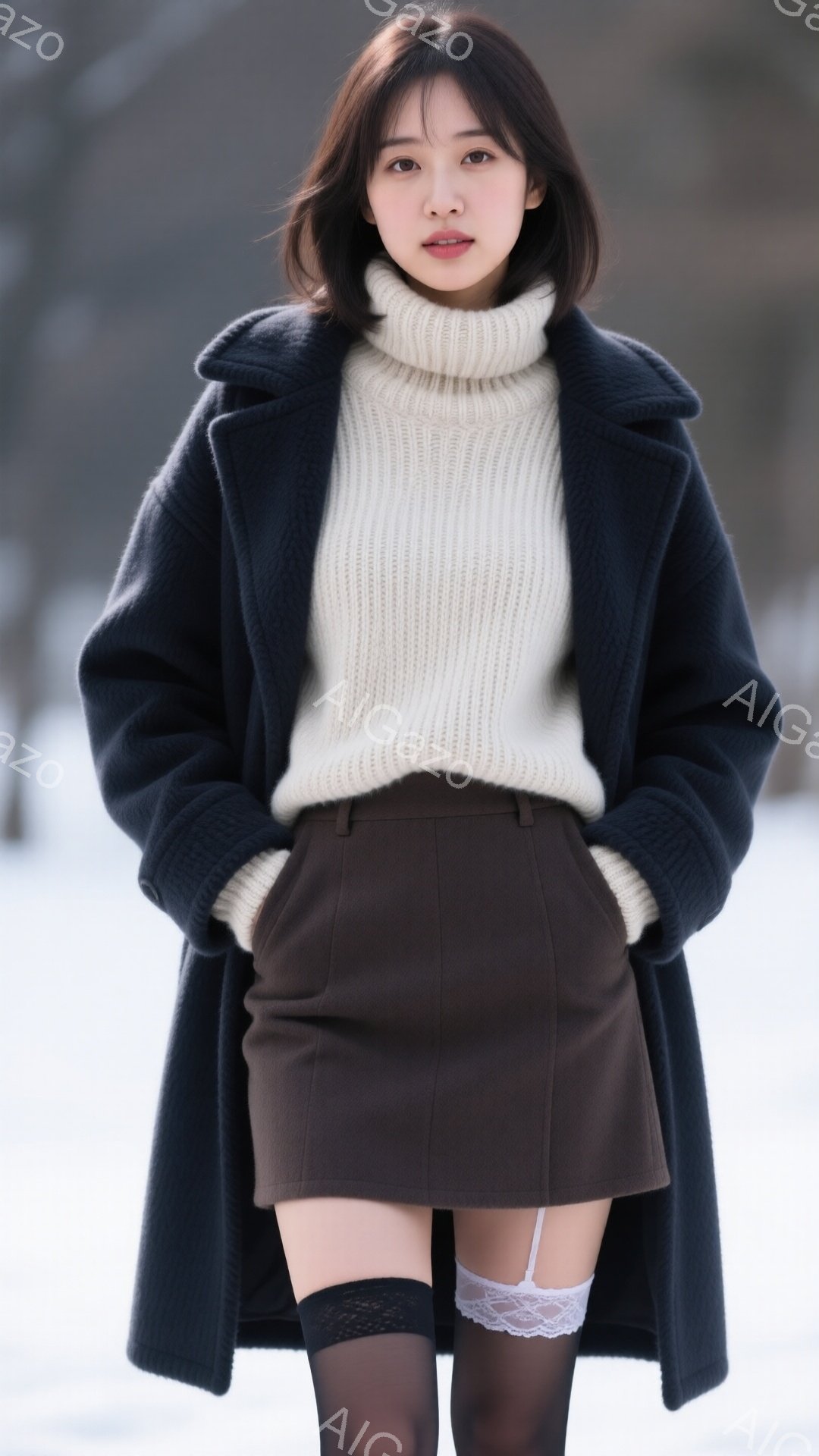 長い茶色のコートを着た若い女性が立っています。彼女はオーバーサイズのベージュのセーターと黒いミニスカートを着用し、白いレースのニーハイソックスを履いています。背景は雪景色で、建物や自然の要素が見え、全体的に冬の穏やかな雰囲気が漂っています。