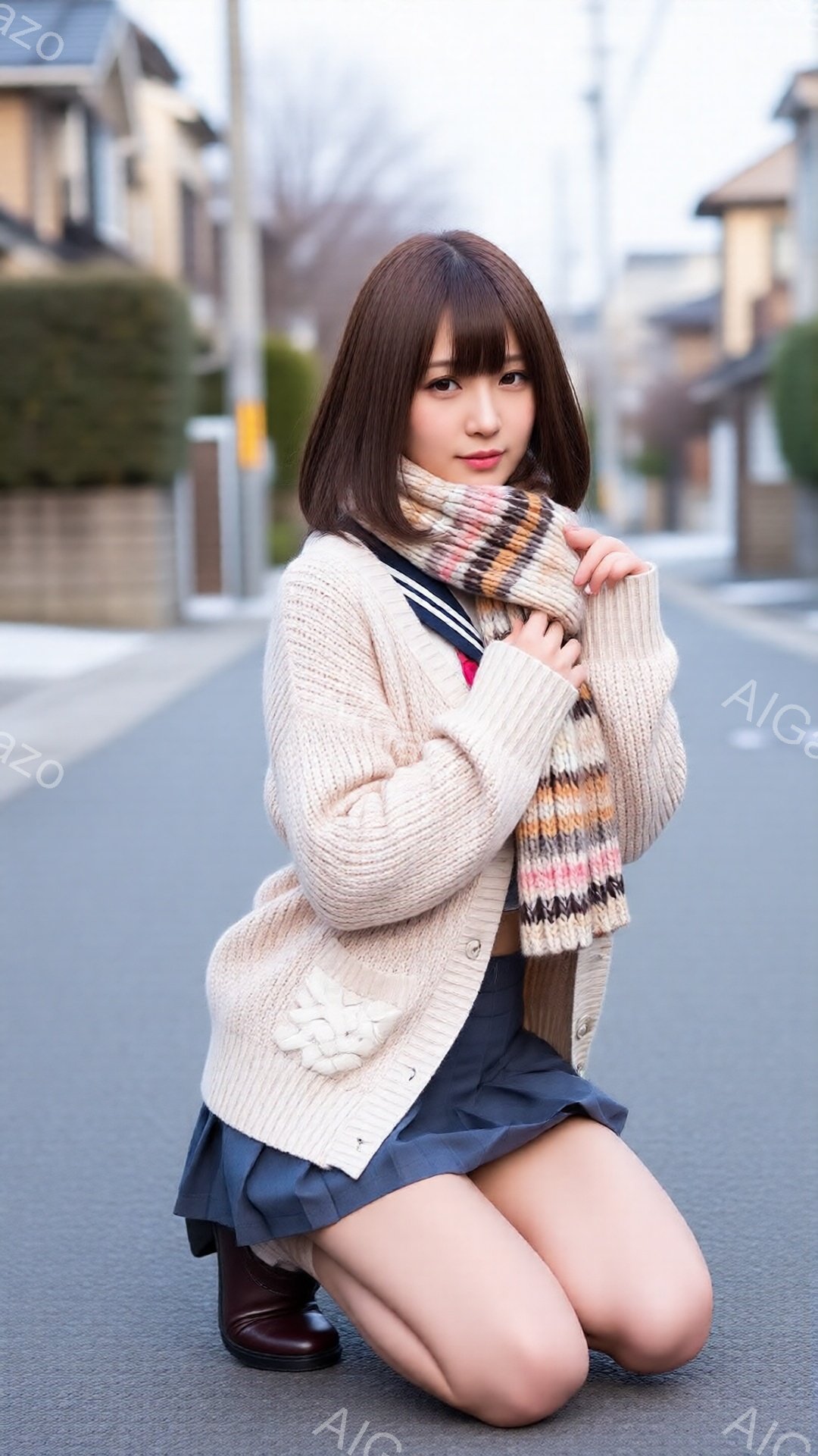 長い黒髪を肩にかける女性が、紺色のプリーツスカートと白いシャツの上に、オフホワイトの編み込みセーターとマフラーを着ています。女性はアスファルトの道路に膝をついて座り、少し下を向いた控えめな表情をしています。背景には日本の住宅街が広がり、曇り空の下、静かで落ち着いた雰囲気が漂っています。