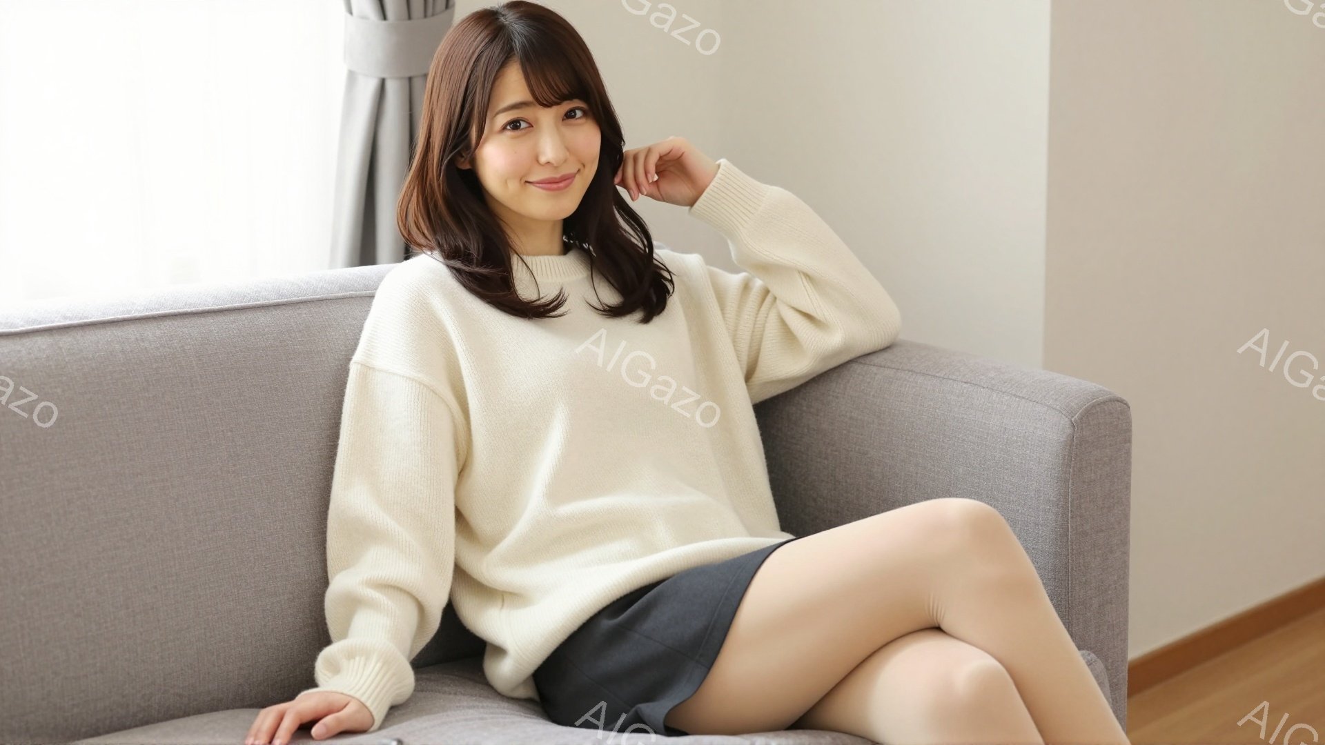 「明るい茶色の髪を肩まで伸ばした女性が、グレーのソファーにリラックスして座っています。オフホワイトのセーターとグレーの短いスカートを着用し、膝を曲げて足を組んでい」は、2025年12月22日に作成されたAI生成画像です。 カジュアルをテーマとした高品質なビジュアル素材で、 1920×1080px の解像度で提供しています。 個人利用・商用利用ともに無料でダウンロード可能で、クレジット表記も不要です。