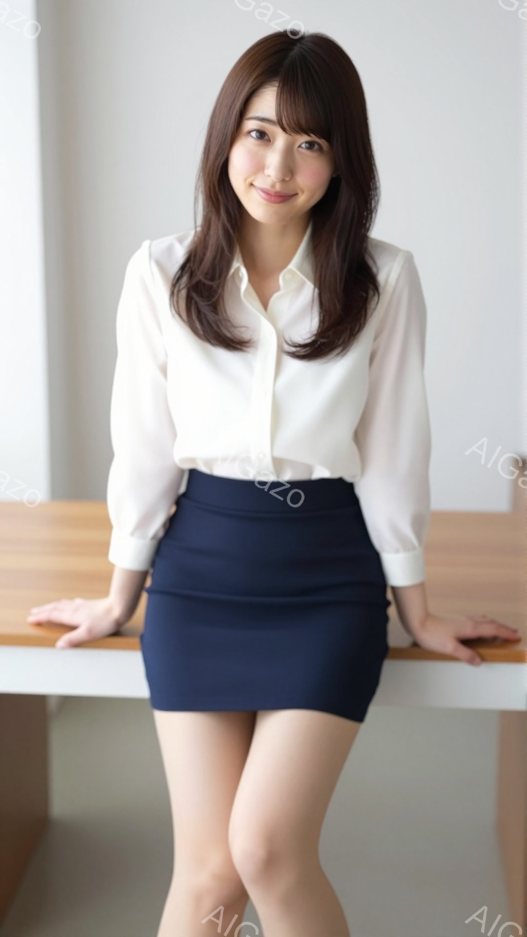 「画像は、白いブラウスと紺色の膝丈スカートを着用した若い女性が写っています。彼女は微笑んでおり、片手を木のテーブルに置き、足を組んで座っています。背景は明るい室内」は、2025年12月22日に作成されたAI生成画像です。 おしゃれをテーマとした高品質なビジュアル素材で、 1080×1920px の解像度で提供しています。 個人利用・商用利用ともに無料でダウンロード可能で、クレジット表記も不要です。