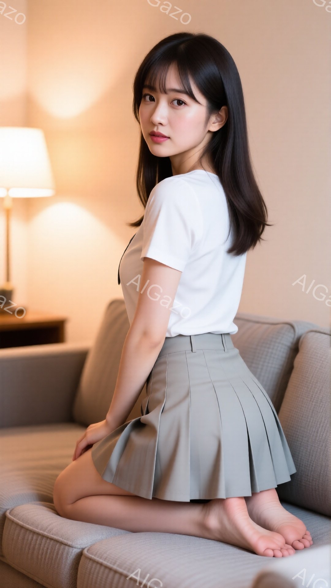長い黒髪で前髪がぱっつんとした女性が、ベージュのスカートと白いブラウスを着てソファーに跪いています。彼女は少し微笑んでいて、横を向いていて、足は裸です。背景には、オフホワイトの壁と小さなテーブルとランプがあり、明るく優しい雰囲気です。