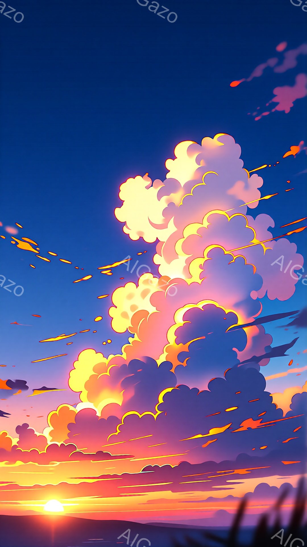 「燃えるような夕焼け空に、巨大な雲が印象的な風景です。地平線には太陽が沈み、雲はオレンジ、ピンク、紫の色合いで染められています。手前に暗いシルエットの山並みと針葉」は、2025年12月22日に作成されたAI生成画像です。 オレンジをテーマとした高品質なビジュアル素材で、 1080×1920px の解像度で提供しています。 個人利用・商用利用ともに無料でダウンロード可能で、クレジット表記も不要です。