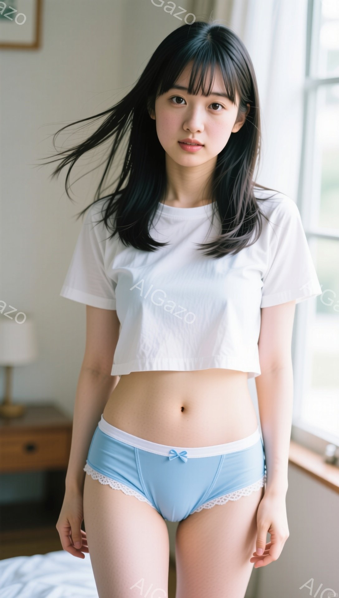「明るいキッチンで、短い茶髪の女性がカメラに向かって微笑んでいます。彼女は水色のブラとショーツのセットを着ており、姿勢は自然でリラックスしています。背景には調理台」は、2025年12月23日に作成されたAI生成画像です。 キッチンをテーマとした高品質なビジュアル素材で、 1088×1920px の解像度で提供しています。 個人利用・商用利用ともに無料でダウンロード可能で、クレジット表記も不要です。