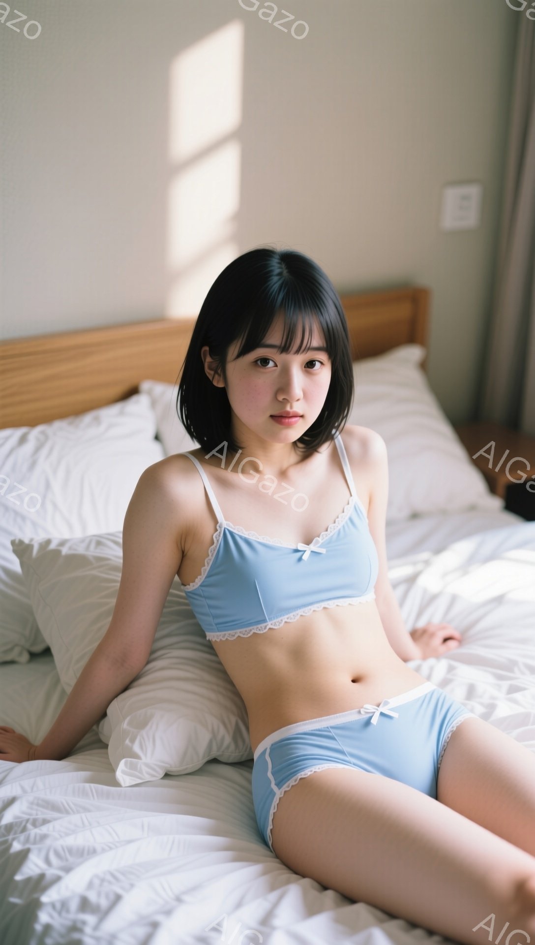 若い女性が薄い水色のブラとショーツのセットを着用し、白いベッドの上に跪いています。彼女は黒髪で前髪が目にふれており、表情はやや控えめで穏やかです。背景にはぼやけたカーテンとベッドサイドテーブルが見え、全体的に柔らかく、親密な雰囲気が漂っています。