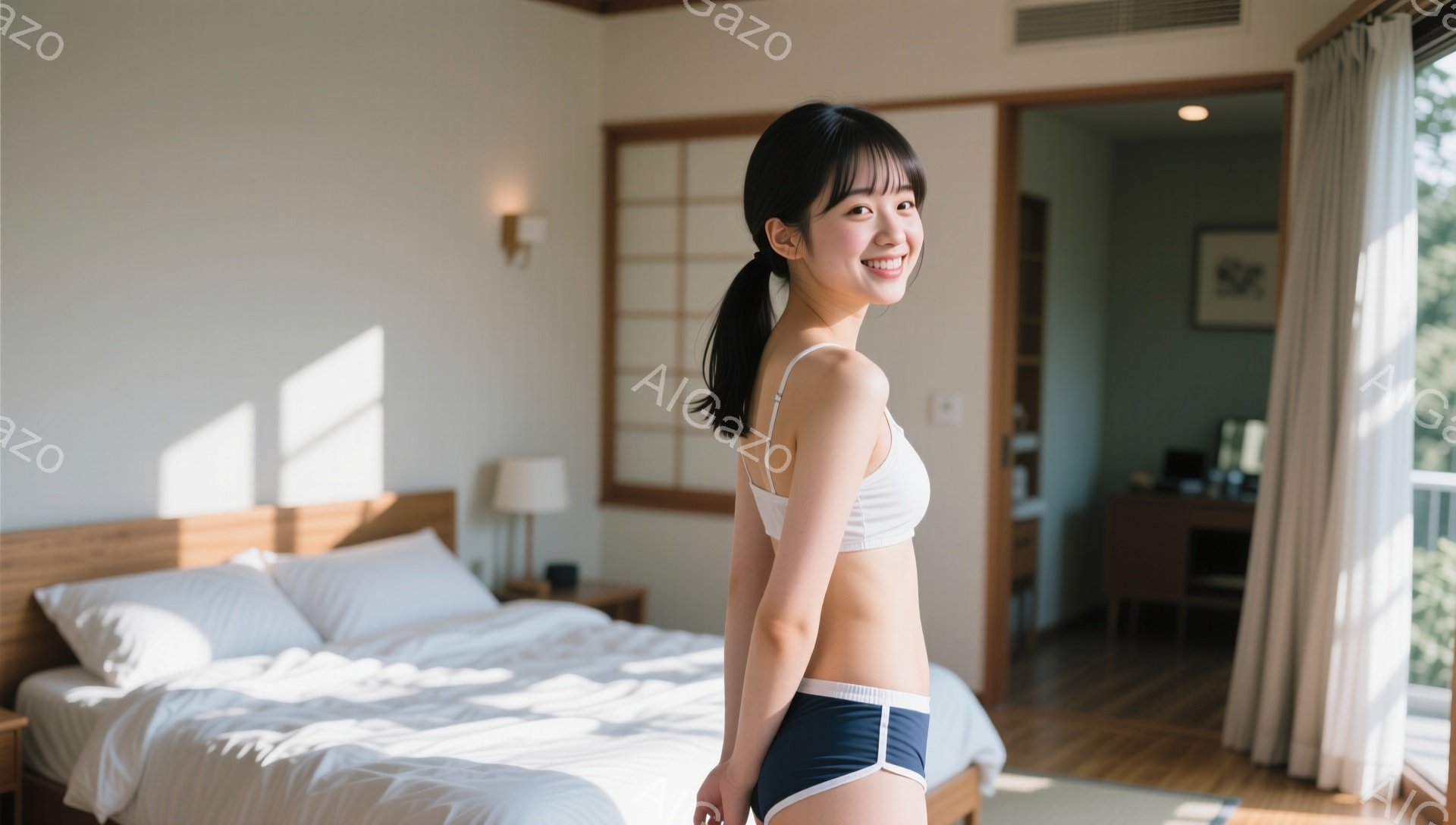 「長い黒髪で前髪ぱっつんの女性が、白いクロップド丈のタンクトップと紺色のブリーフを身に着けて立っています。彼女はまっすぐ前を向き、表情はやや無表情です。背景にはベ」は、2025年12月23日に作成されたAI生成画像です。 インドアをテーマとした高品質なビジュアル素材で、 1920×1088px の解像度で提供しています。 個人利用・商用利用ともに無料でダウンロード可能で、クレジット表記も不要です。