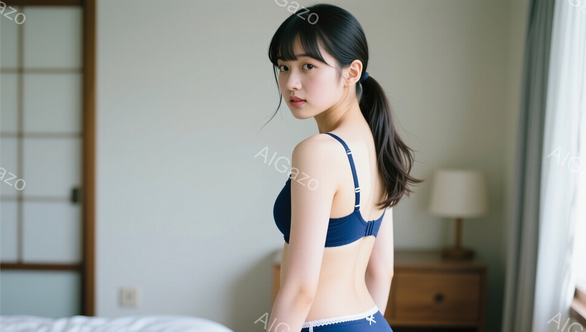 「長い黒髪をポニーテールにした若い女性が、紺色のブラジャーとショーツのセットアップ姿で微笑んでいます。彼女は少し体を前に傾け、カメラに向かって明るい笑顔を浮かべて」は、2025年12月23日に作成されたAI生成画像です。 ショーツをテーマとした高品質なビジュアル素材で、 1920×1088px の解像度で提供しています。 個人利用・商用利用ともに無料でダウンロード可能で、クレジット表記も不要です。