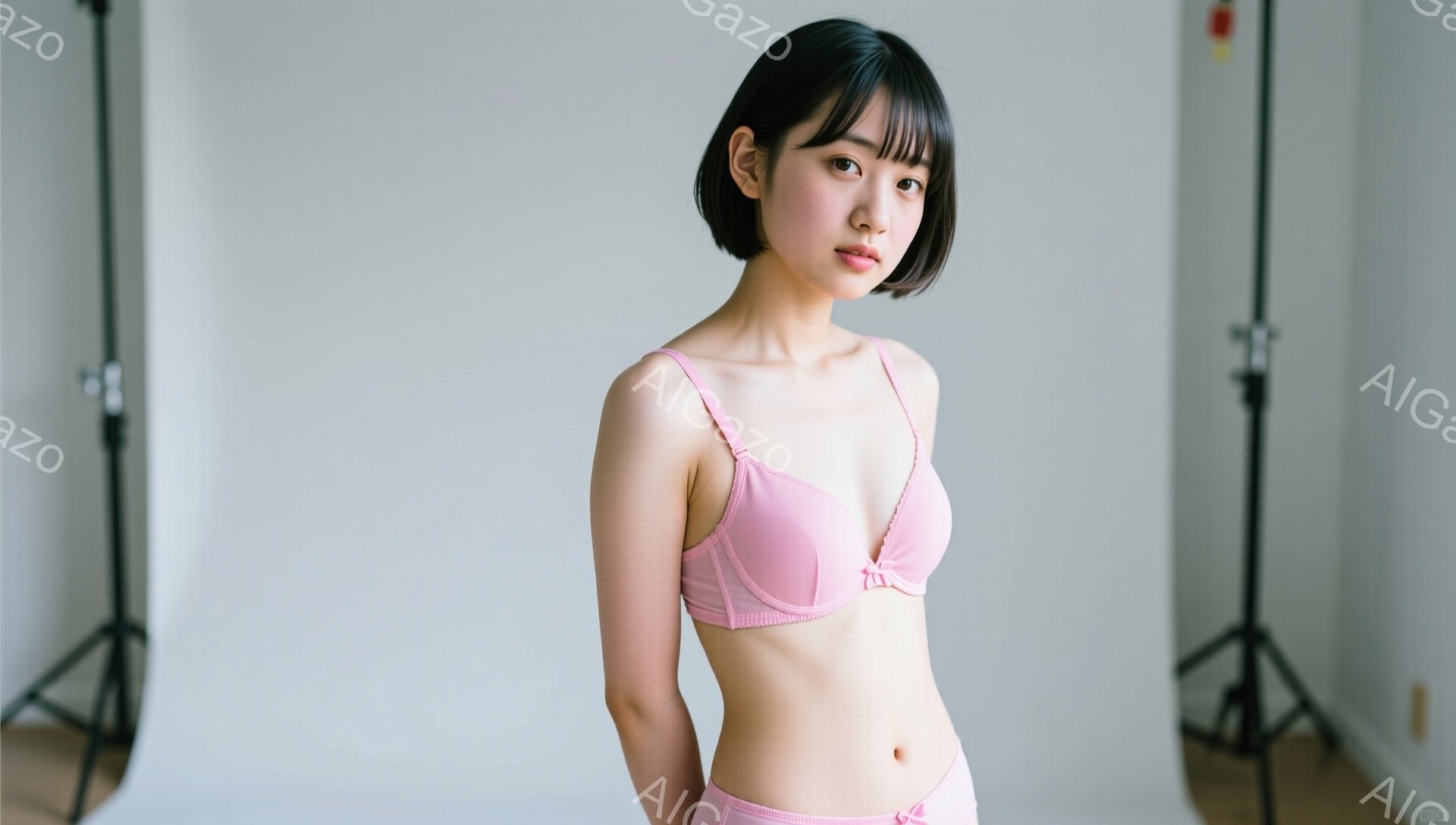 ショートヘアの女性が、薄いピンク色のブラとショーツを身に着けて立っている。彼女はカメラを見つめ、やや微笑んでいる表情で、リラックスした姿勢を保っている。背景は白い壁で、スタジオの照明機材が配置されており、全体的に清潔でシンプルな雰囲気を醸し出している。