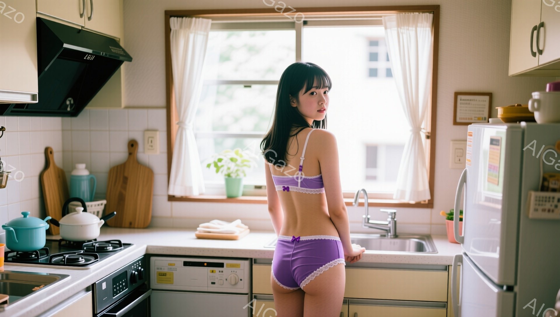 明るいキッチンを背景に、紫色の下着姿の若い女性がカウンターにもたれかかって立っています。黒髪のロングヘアは肩にかかり、少し微笑んだ表情でこちらを見ています。キッチンの背景には、調理器具や冷蔵庫が見え、家庭的な雰囲気です。