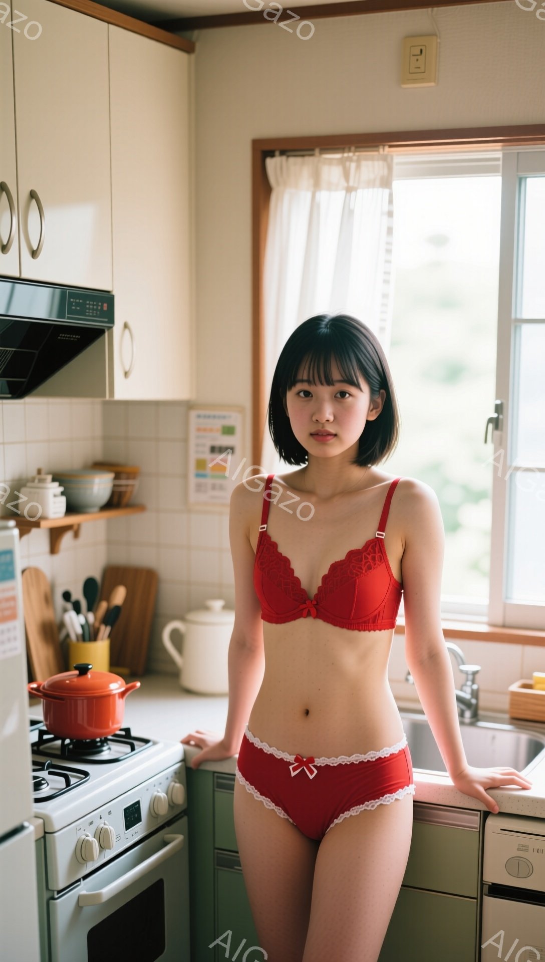 鮮やかな赤色のブラジャーとショーツを身につけた若い女性が、明るいキッチンに立っています。彼女はストレートの黒髪で、前髪が眉毛にかかっています。表情は落ち着いており、若干の微笑みが伺えます。
