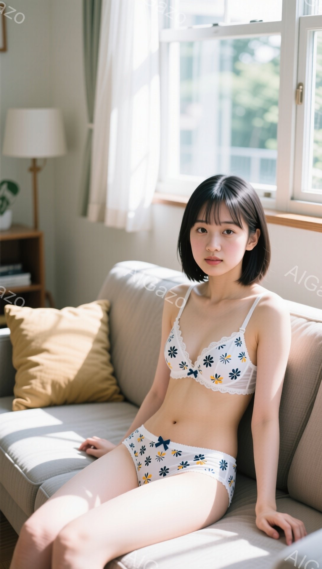 画像には、同じように黒髪で前髪を下ろした若い女性が二人、明るい色のソファに横たわっています。彼女たちは白い花柄のブラジャーとショーツを身に着け、リラックスした表情でカメラを見つめています。背景には、本棚や植物が配置された室内が写り、暖かく穏やかな雰囲気を醸し出しています。