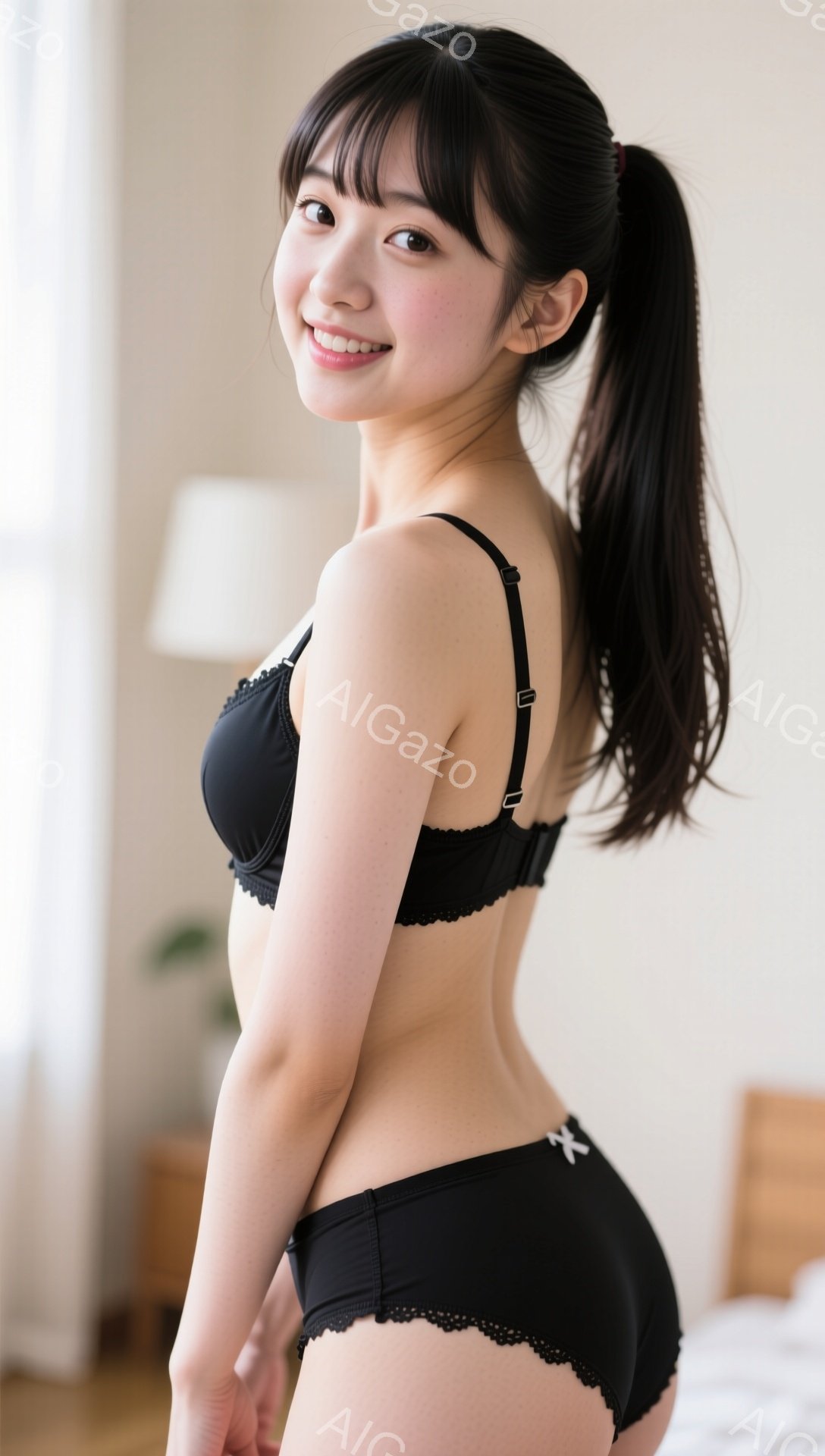 黒いレースのブラとショーツを身につけた若い女性が写っています。彼女は長い黒髪をポニーテールにし、わずかに微笑んでいます。背景には木製の家具が見え、室内は明るく、暖かく、リラックスした雰囲気です。