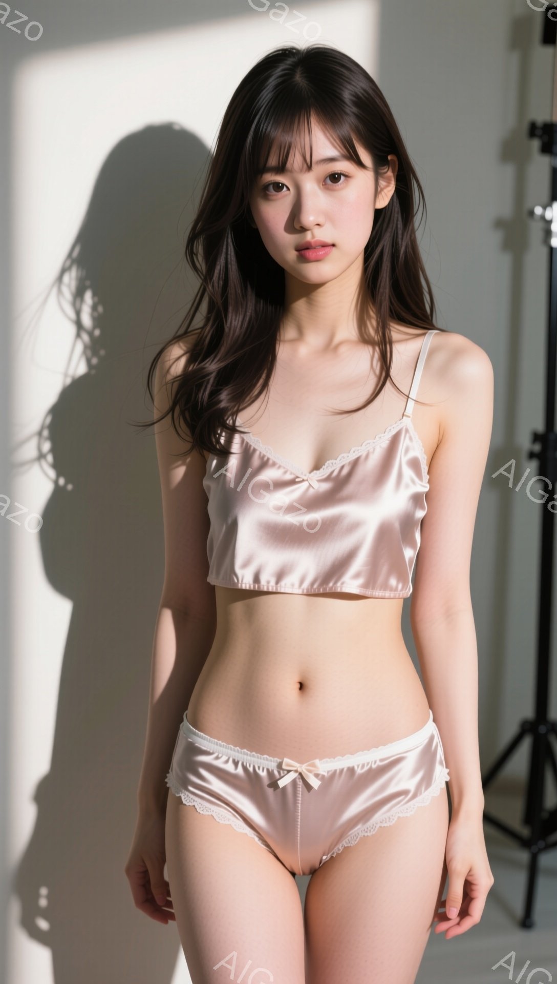 長い黒髪で、前髪は眉毛にかかるように切り揃えられています。ピンク色のサテンのキャミソールとショーツを着用し、やや緊張した表情で正面を向いています。背景には木製の家具と窓が見え、明るく柔らかな室内光が全体を照らしています。