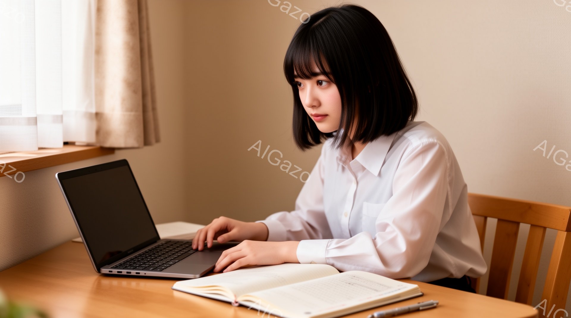 「画像には、制服を着た若い女性が教室で勉強している様子が写っています。彼女は白いシャツに紺色のリボンとネクタイ、そしてダークブラウンのロングヘアで、真剣な表情で本」は、2025年12月24日に作成されたAI生成画像です。 ダークブラウンをテーマとした高品質なビジュアル素材で、 1920×1072px の解像度で提供しています。 個人利用・商用利用ともに無料でダウンロード可能で、クレジット表記も不要です。