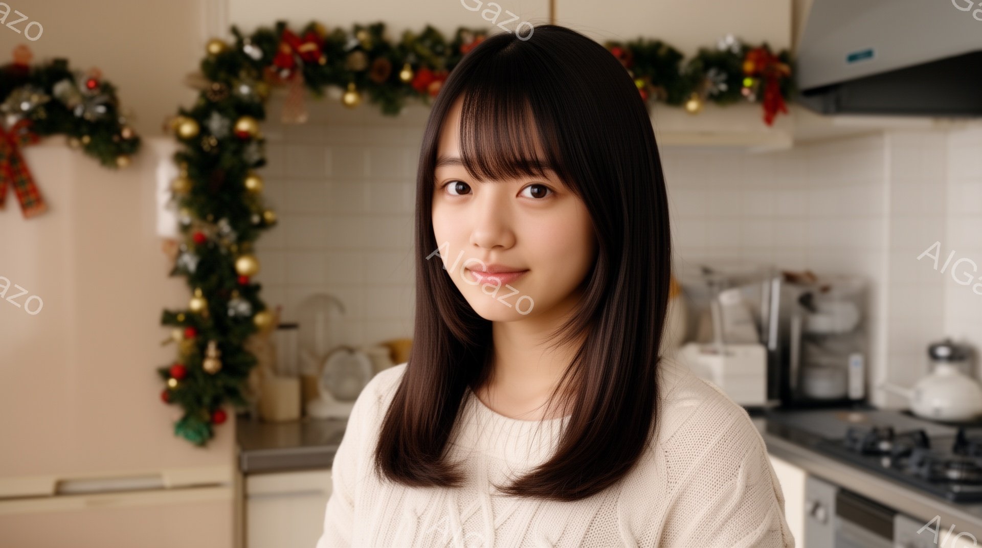 「長い黒髪で、優しい笑顔を浮かべた女性が写っている。ベージュ色のセーターを着ており、両手を合わせて祈るようなポーズをとっている。背景にはクリスマスツリーやプレゼン」は、2025年12月24日に作成されたAI生成画像です。 キッチンをテーマとした高品質なビジュアル素材で、 1920×1072px の解像度で提供しています。 個人利用・商用利用ともに無料でダウンロード可能で、クレジット表記も不要です。