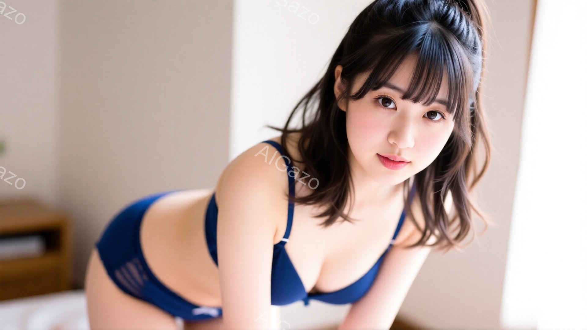 「長い黒髪で前髪が少しカールした女性が、青いブラとショーツのセットアップを着ています。彼女は床にうつ伏せになり、カメラの方を見て微笑んでいます。背景には白を基調と」は、2025年12月24日に作成されたAI生成画像です。 インドアをテーマとした高品質なビジュアル素材で、 1920×1080px の解像度で提供しています。 個人利用・商用利用ともに無料でダウンロード可能で、クレジット表記も不要です。