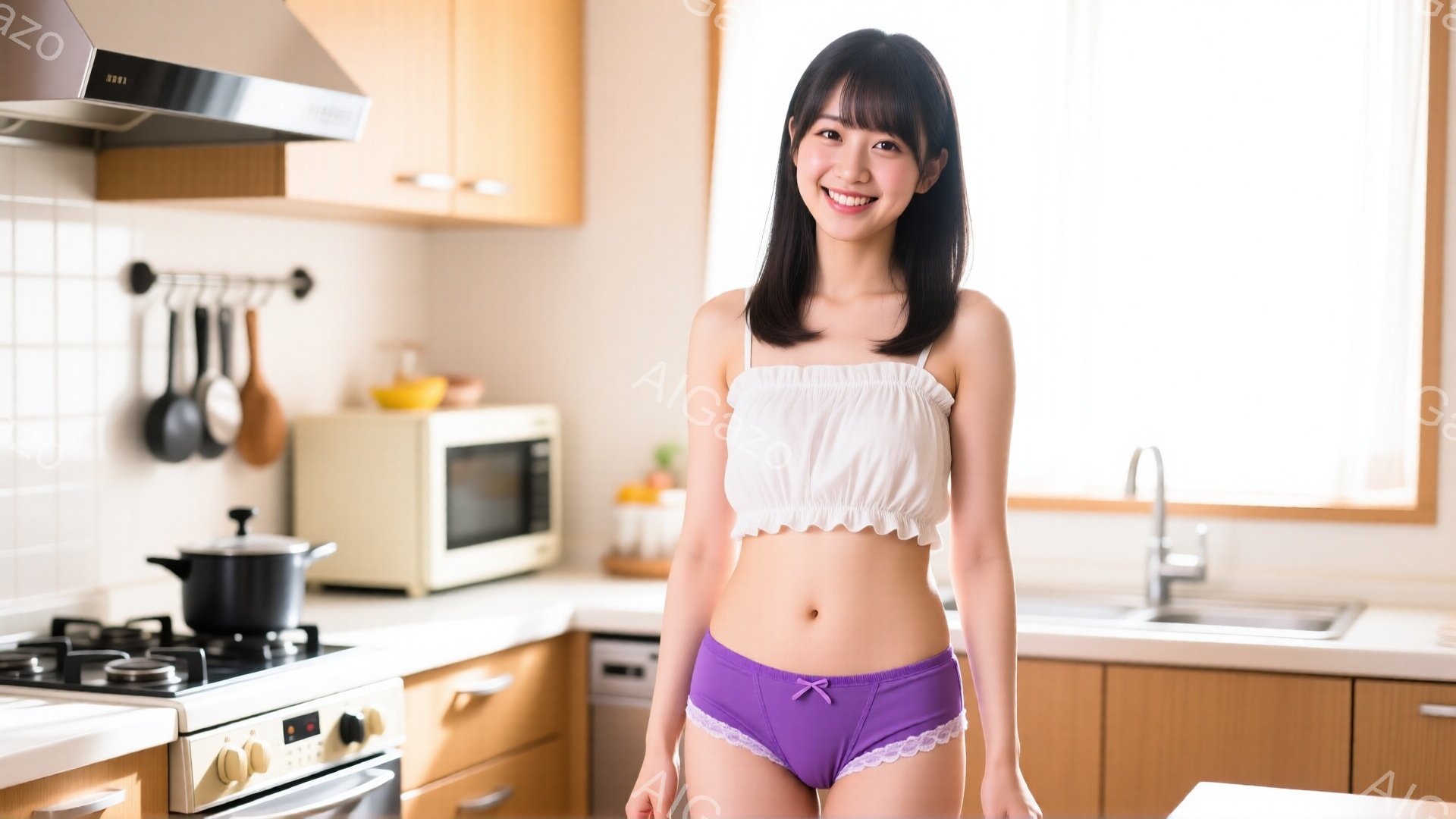 長い黒髪をセンターパートにした若い女性が、白いタンクトップと紫色の下着姿でキッチンに立っています。彼女は微笑んでおり、片手をシンクに添え、リラックスしたポーズをとっています。背景には、電子レンジ、調理器具、そして明るい光が差し込む窓が見え、家庭的で温かい雰囲気です。