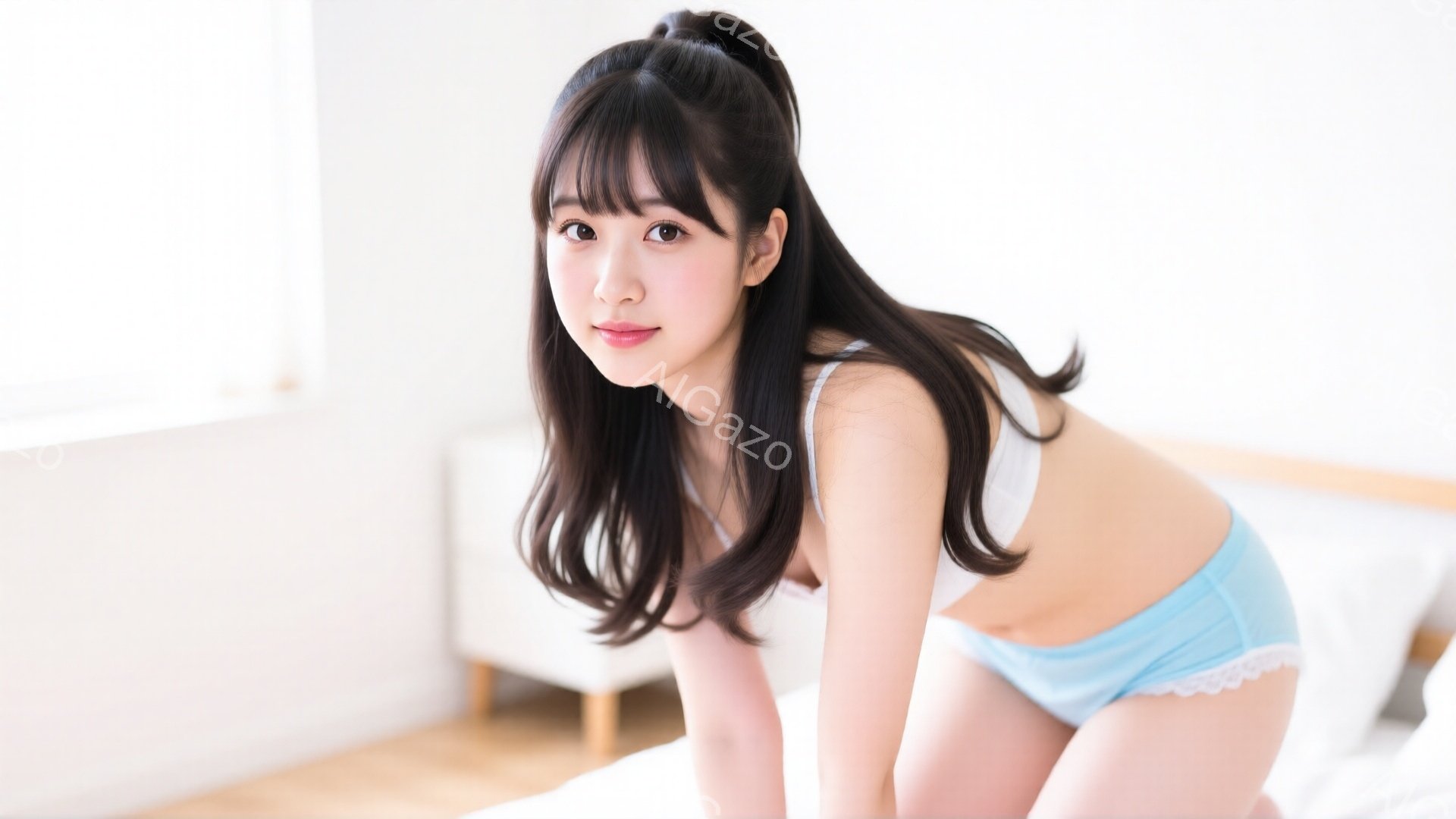 「黒髪の長い前髪を持つ女性が、ターコイズブルーのランジェリーを着用し、カメラを見つめています。彼女はベッドかソファのようなものの上でうつ伏せになり、わずかに体を起」は、2025年12月24日に作成されたAI生成画像です。 うつ伏せをテーマとした高品質なビジュアル素材で、 1920×1080px の解像度で提供しています。 個人利用・商用利用ともに無料でダウンロード可能で、クレジット表記も不要です。