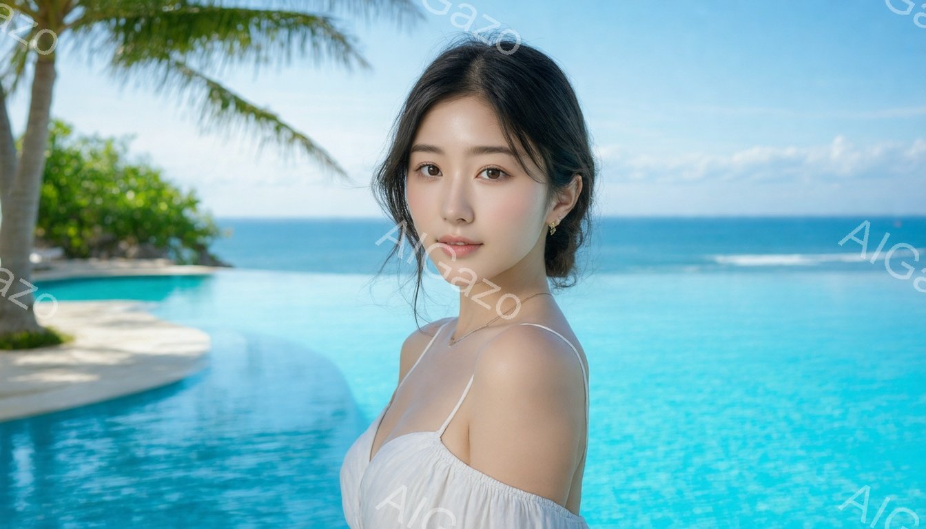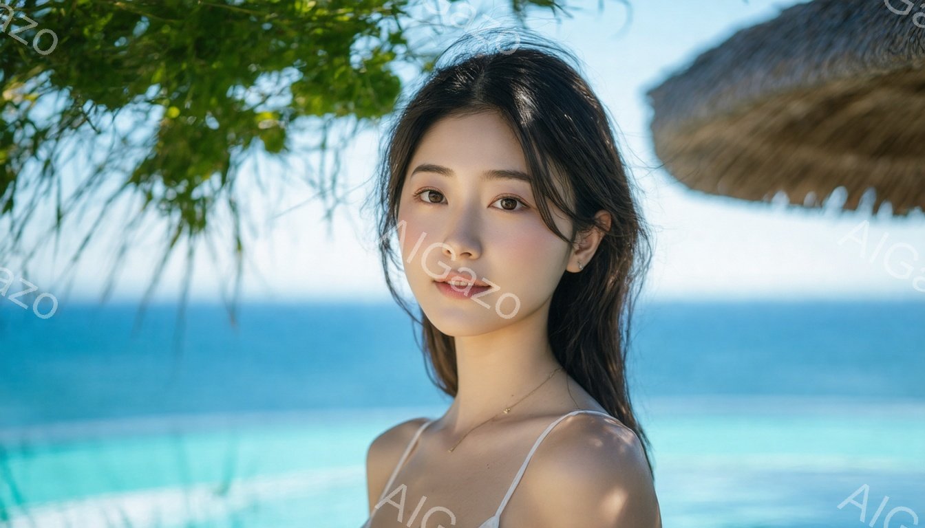「浅い水色のプールを背景に、黒髪の女性がこちらを見つめている。彼女は白い肩出しのトップスを着ており、髪は後ろで軽くまとめられている。穏やかな表情で、わずかに微笑ん」は、2025年12月30日に作成されたAI生成画像です。 トップスをテーマとした高品質なビジュアル素材で、 1344×768px の解像度で提供しています。 個人利用・商用利用ともに無料でダウンロード可能で、クレジット表記も不要です。