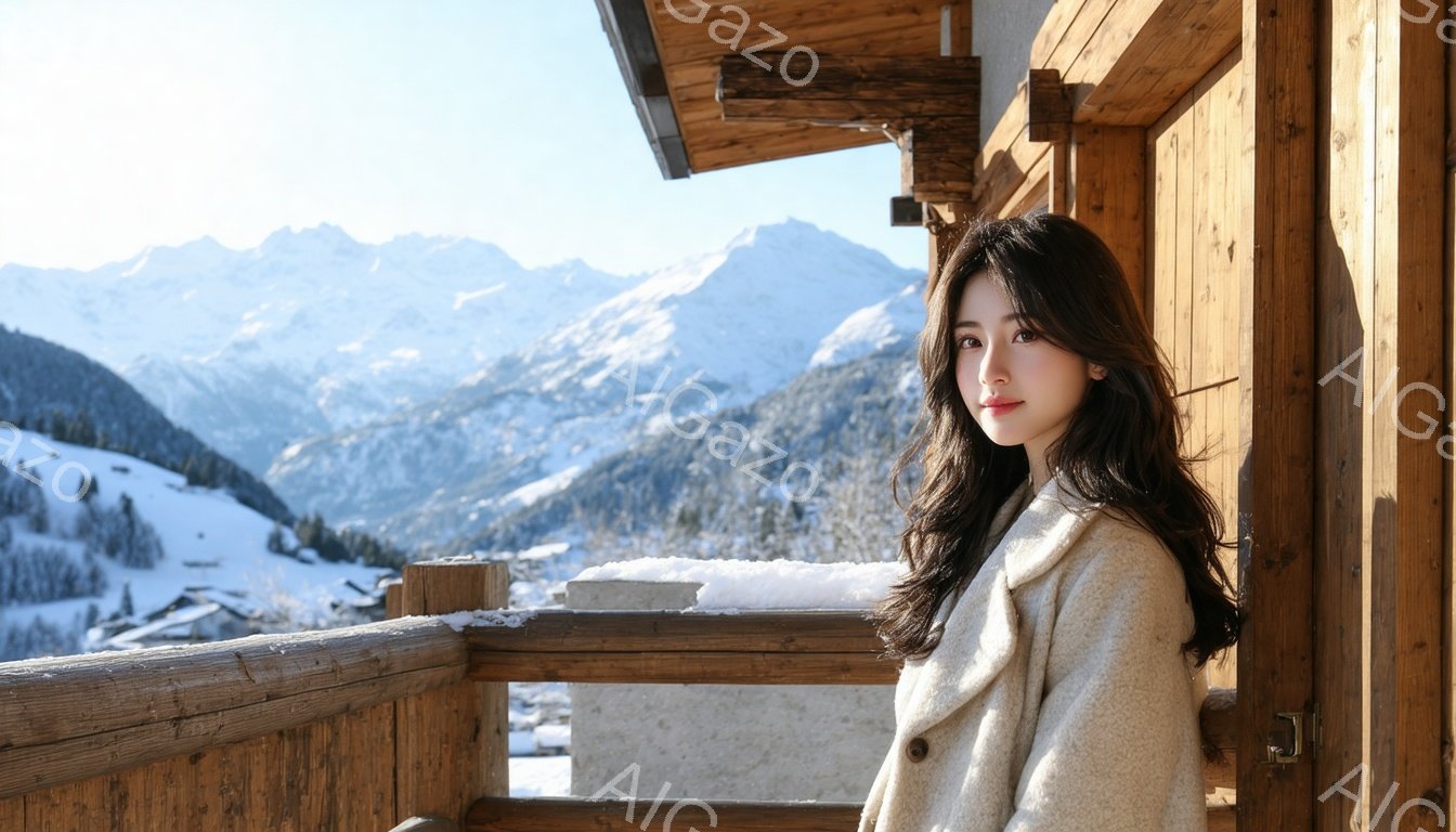 長いダークブラウンの髪を肩にかける女性が、木製の柵の前で立っています。彼女はオフホワイトのオーバーサイズのセーターを着ており、穏やかな微笑みを浮かべています。背景には雪に覆われた山々が広がり、晴れた冬の日の穏やかな雰囲気を醸し出しています。