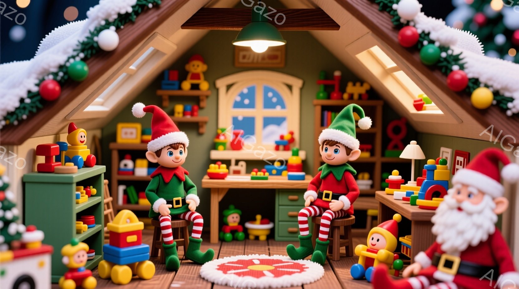 おもちゃのワークショップのような、屋根裏部屋の様子を描いています。二人のエルフは緑の帽子と赤い服を着て、赤い縞模様のズボンをはき、おもちゃの積み木を組み立てる作業をしています。背景には、おもちゃやクリスマスの飾り付けが並び、温かく、お祭り気分にあふれた雰囲気です。