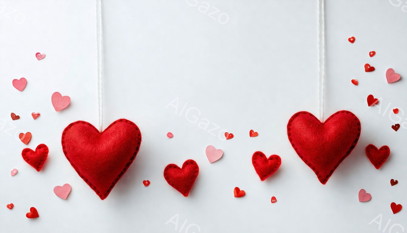 「白い背景に赤いハート型の装飾が空中に吊り下げられています。床には、大きな赤いハート型クッションと白いハート型クッションがいくつか置かれ、さらに小さなハートの紙吹」は、2025年12月30日に作成されたAI生成画像です。 イベントをテーマとした高品質なビジュアル素材で、 1344×768px の解像度で提供しています。 個人利用・商用利用ともに無料でダウンロード可能で、クレジット表記も不要です。