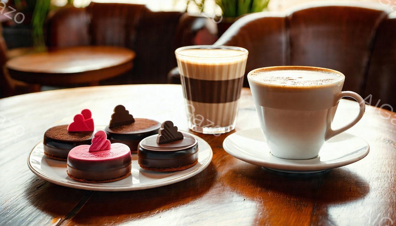 濃い木目のテーブルの上に、可愛らしいケーキとチョコレートが並べられています。カフェラテの入った白いカップとソーサーが中央に置かれ、その周りをイチゴを飾った四角いケーキと様々なチョコレートが彩っています。背景にはぼやけたカフェの椅子が見え、温かみのある光が全体を包み込んでいます。