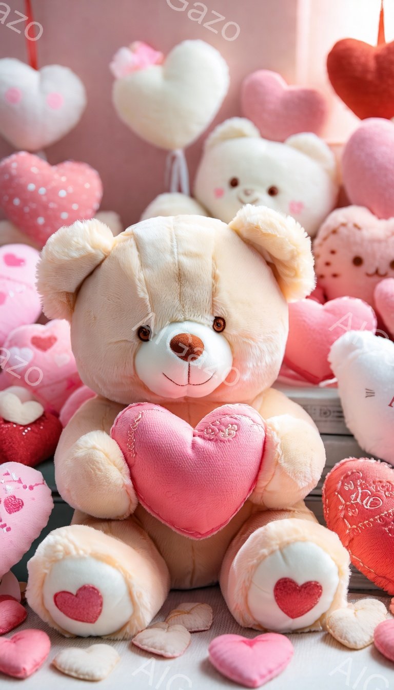 「白いテディベアが、赤いハート型の枕を抱きしめて座っています。周りには、ピンクや赤のハート型のクッションや飾りがたくさん散りばめられており、背景にはぼやけた窓と庭」は、2025年12月30日に作成されたAI生成画像です。 ギフトをテーマとした高品質なビジュアル素材で、 768×1344px の解像度で提供しています。 個人利用・商用利用ともに無料でダウンロード可能で、クレジット表記も不要です。