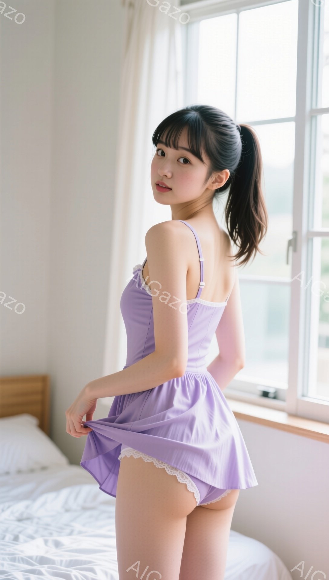 明るい室内で、茶色の前髪とポニーテールにした若い女性が、薄紫色のキャミソールとフリルのついた白いショートパンツを身に着けています。彼女は膝をついてベッドに座り、スカートの裾を軽くつまんで少し微笑んでいます。背景には窓があり、緑豊かな木々が見え、穏やかでリラックスした雰囲気を醸し出しています。